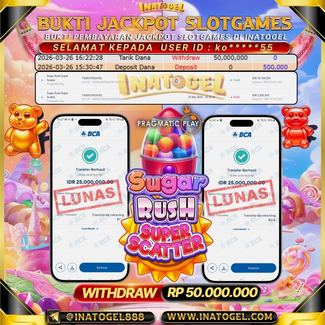 Selamat kepada UserId ko*****55 telah berhasil mendapatkan kemenangan jackpot pada permainan Slot Game Sugar Rush Super Scatter Inatogel sebesar Rp50,000,000,- . Inatogel situs terpercaya sejak dulu hingga saat ini , Untuk kemenangan berapapun pasti akan kami bayarkan . Jangan ragu bermain di Ina Togel . Kami pihak Inatogel Menyampaikan terima kasih kepada seluruh member Ina Togel yang telah Percaya dan setia Bersama kami bermain di Inatogel hingga saat ini.