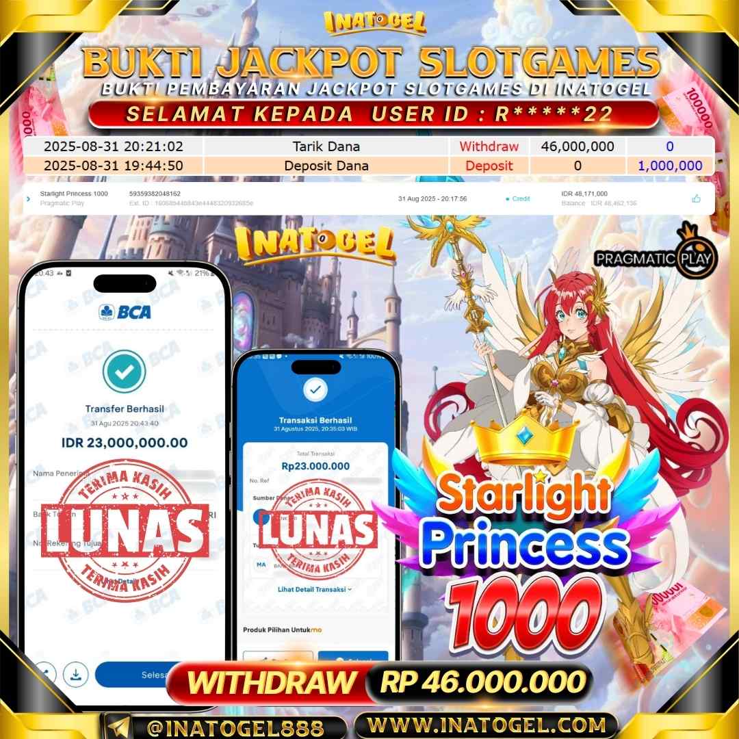 Selamat kepada User Id R*****22 telah berhasil mendapatkan kemenangan jackpot pada permainan SlotGame Starlight Princess 1000 sebesar Rp46,000,000,- . Inatogel situs terpercaya sejak dulu hingga saat ini , Untuk kemenangan berapapun pasti akan kami bayarkan . Jangan ragu bermain di Ina Togel . Kami pihak Inatogel Menyampaikan terima kasih kepada seluruh member Ina Togel yang telah Percaya dan setia Bersama kami bermain di Inatogel hingga saat ini.