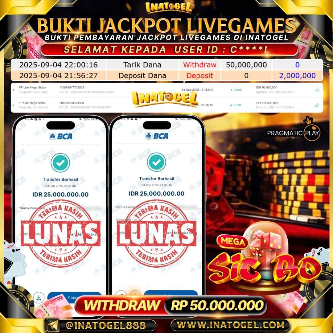 Selamat kepada User Id C*****L telah berhasil mendapatkan kemenangan jackpot pada permainan LiveGame PP Live Mega Sicbo Inatogel sebesar Rp50,000,000,- Inatogel situs terpercaya sejak dulu hingga saat ini , Untuk kemenangan berapapun pasti akan kami bayarkan . Jangan ragu bermain di Ina Togel . Kami pihak Inatogel Menyampaikan terima kasih kepada seluruh member Ina Togel yang telah Percaya dan setia Bersama kami bermain di Inatogel hingga saat ini.