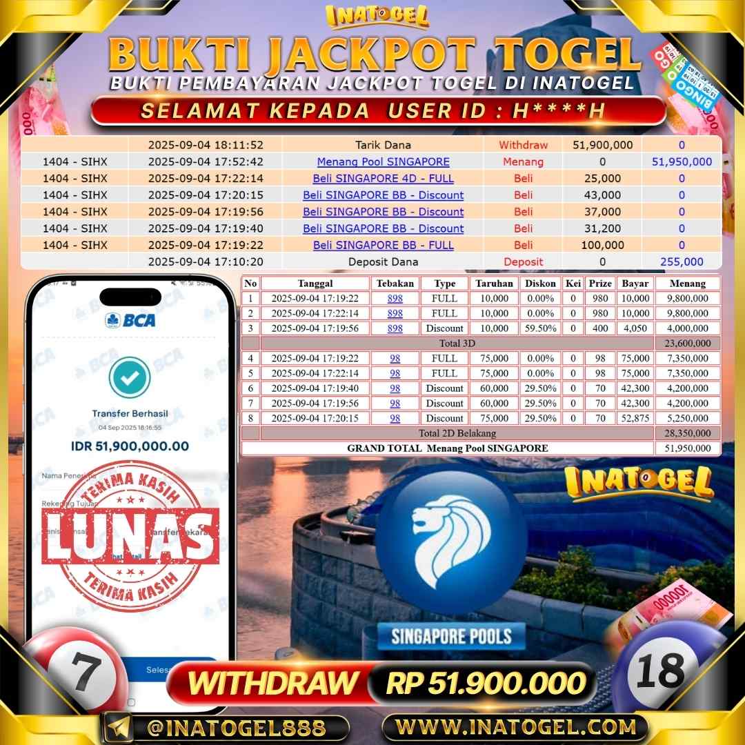 Inatogel Jackpot Togel SINGAPORE Rp51,900,000