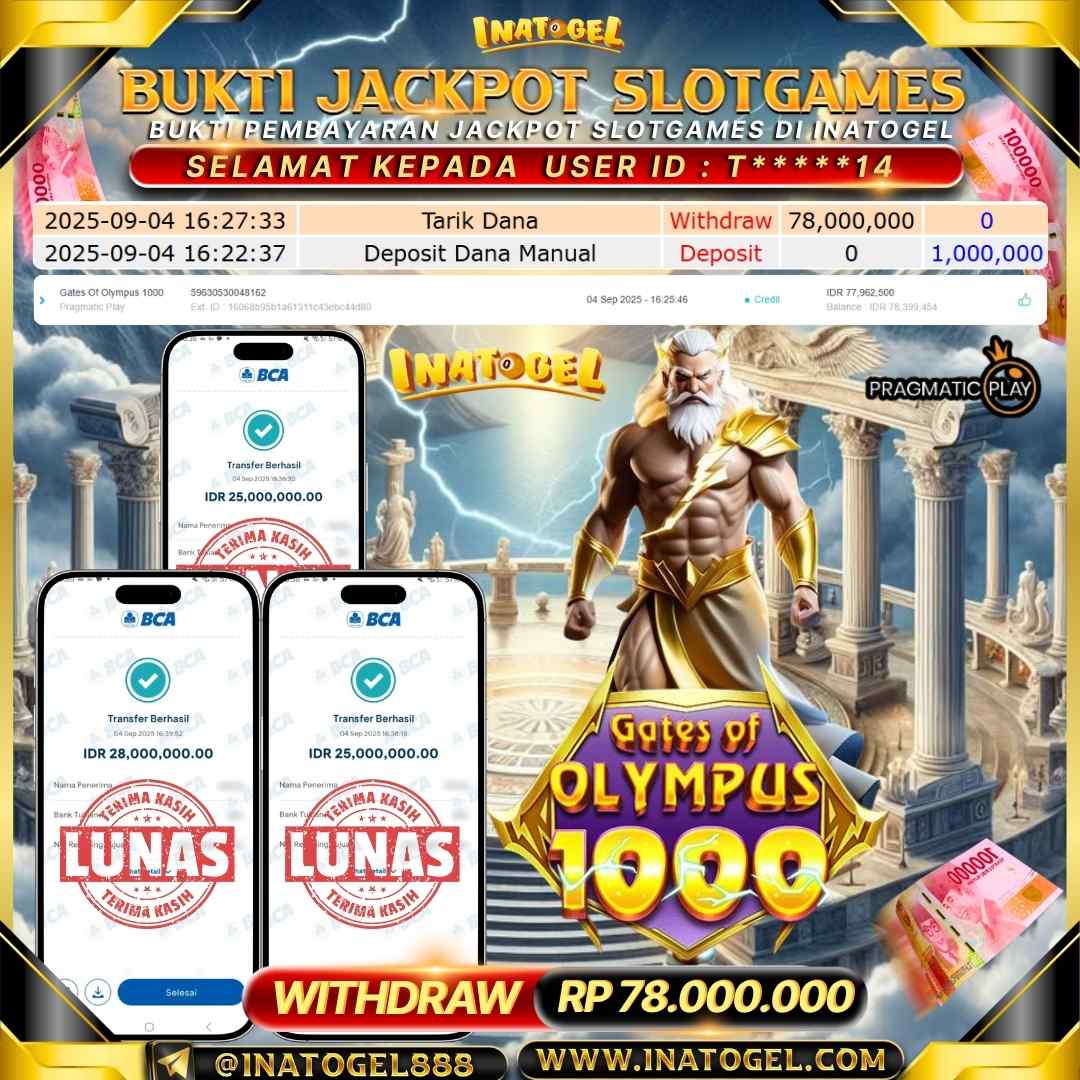 Selamat kepada User Id T*****14 telah berhasil mendapatkan kemenangan jackpot pada permainan SlotGame Gates Of Olympus 1000 sebesar Rp78,000,000,- . Inatogel situs terpercaya sejak dulu hingga saat ini , Untuk kemenangan berapapun pasti akan kami bayarkan . Jangan ragu bermain di Ina Togel . Kami pihak Inatogel Menyampaikan terima kasih kepada seluruh member Ina Togel yang telah Percaya dan setia Bersama kami bermain di Inatogel hingga saat ini.