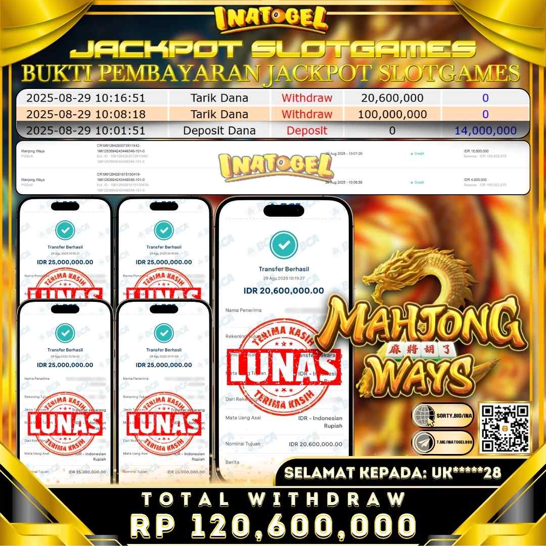 Selamat kepada User Id UK*****28 telah berhasil mendapatkan kemenangan jackpot pada permainan SlotGame Mahjong Ways sebesar Rp120,600,000,- . Inatogel situs terpercaya sejak dulu hingga saat ini , Untuk kemenangan berapapun pasti akan kami bayarkan . Jangan ragu bermain di Ina Togel . Kami pihak Inatogel Menyampaikan terima kasih kepada seluruh member Ina Togel yang telah Percaya dan setia Bersama kami bermain di Inatogel hingga saat ini.