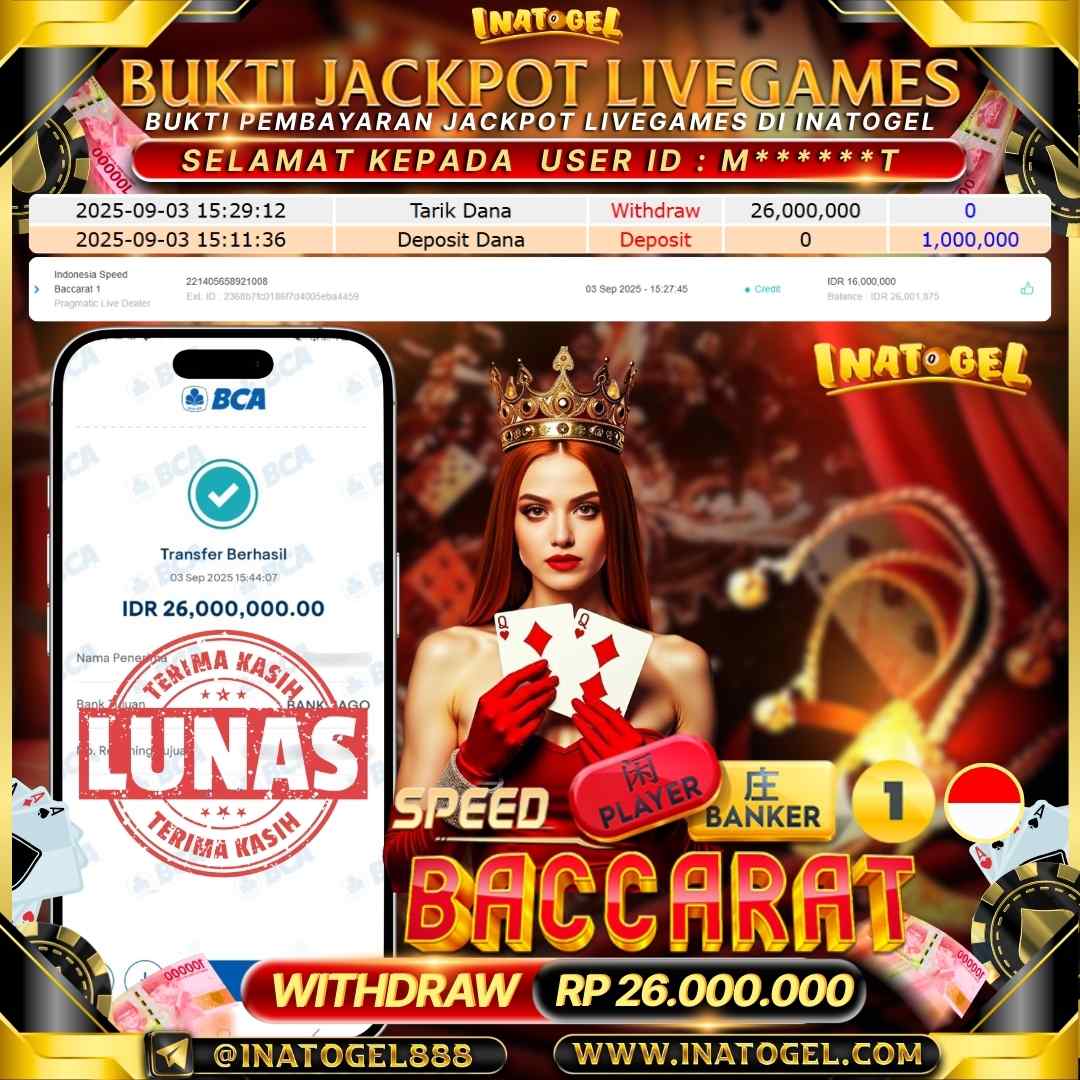 Selamat kepada User Id M*****T telah berhasil mendapatkan kemenangan jackpot pada permainan LiveGame PP Live Indonesia Speed Baccarat 1 Inatogel sebesar Rp26,000,000,- Inatogel situs terpercaya sejak dulu hingga saat ini , Untuk kemenangan berapapun pasti akan kami bayarkan . Jangan ragu bermain di Ina Togel . Kami pihak Inatogel Menyampaikan terima kasih kepada seluruh member Ina Togel yang telah Percaya dan setia Bersama kami bermain di Inatogel hingga saat ini.