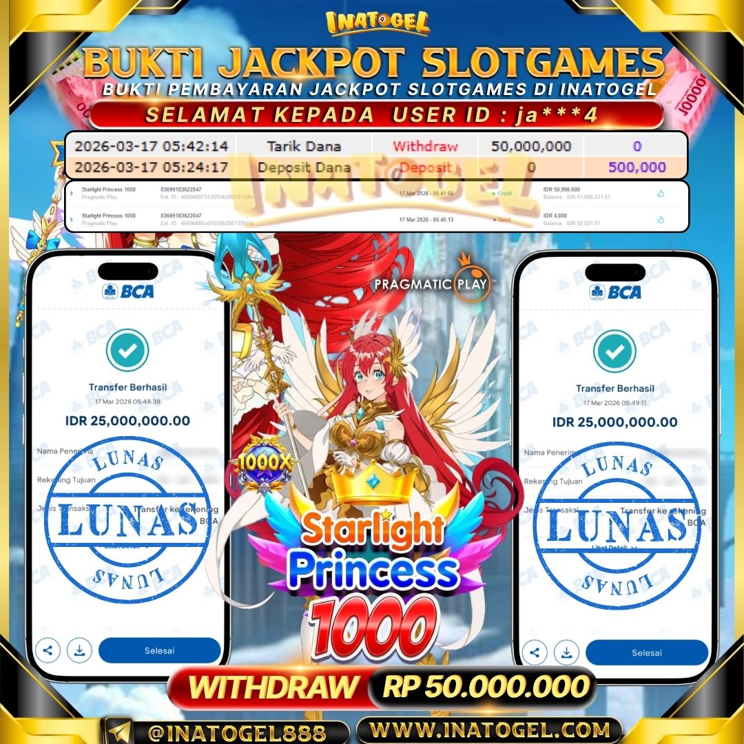 Selamat kepada User Id ja***4 telah berhasil mendapatkan kemenangan jackpot pada permainan Slot Games Starlight Princess 1000 sebesar Rp 50.000.000 natogel situs terpercaya sejak dulu hingga saat ini , Untuk kemenangan berapapun pasti akan kami bayarkan . Jangan ragu bermain di Ina Togel . Kami pihak Inatogel Menyampaikan terima kasih kepada seluruh member Ina Togel yang telah Percaya dan setia Bersama kami bermain di Inatogel saat ini.