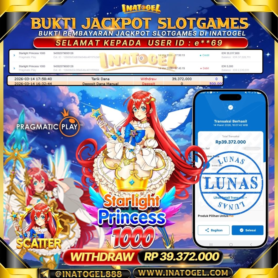Selamat kepada UserId e**69 telah berhasil mendapatkan kemenangan jackpot pada permainan SlotGame Starlight Princess 1000 Inatogel sebesar Rp 39,372,000,- . Inatogel situs terpercaya sejak dulu hingga saat ini , Untuk kemenangan berapapun pasti akan kami bayarkan . Jangan ragu bermain di Ina Togel . Kami pihak Inatogel Menyampaikan terima kasih kepada seluruh member Ina Togel yang telah Percaya dan setia Bersama kami bermain di