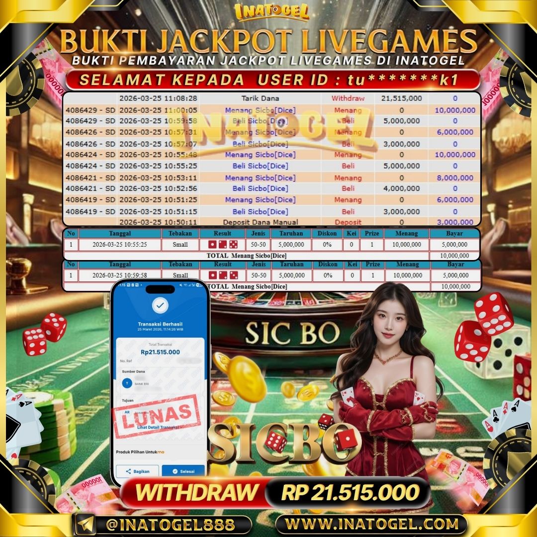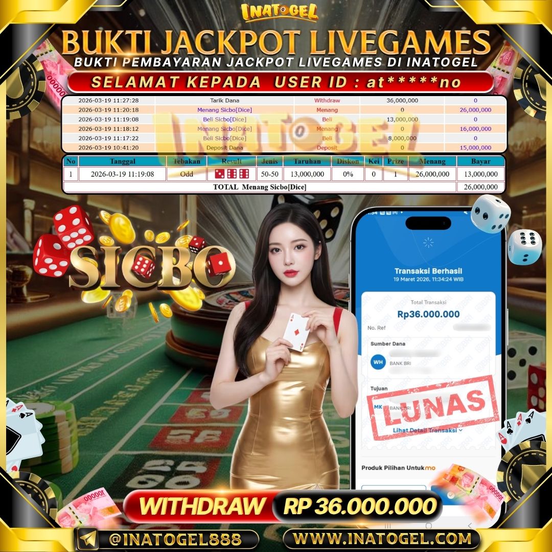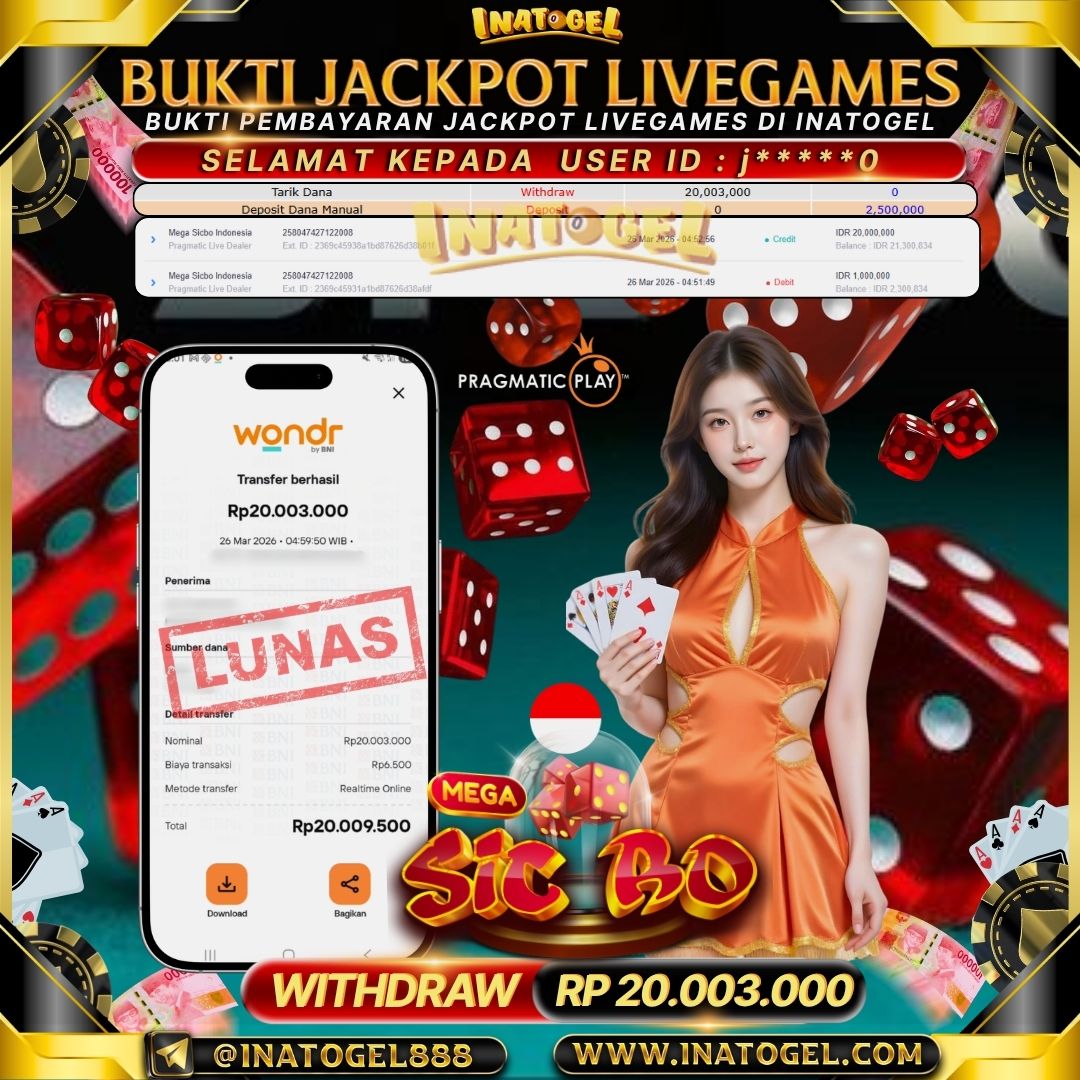 Selamat kepada User Id j*****0 telah berhasil mendapatkan kemenangan jackpot pada permainan Live Games Mega Sicbo Indonesia sebesar Rp20,003,000,- . Inatogel situs terpercaya sejak dulu hingga saat ini , Untuk kemenangan berapapun pasti akan kami bayarkan . Jangan ragu bermain di Ina Togel . Kami pihak Inatogel Menyampaikan terima kasih kepada seluruh member Ina Togel yang telah Percaya dan setia Bersama kami bermain di Inatogel saat ini.