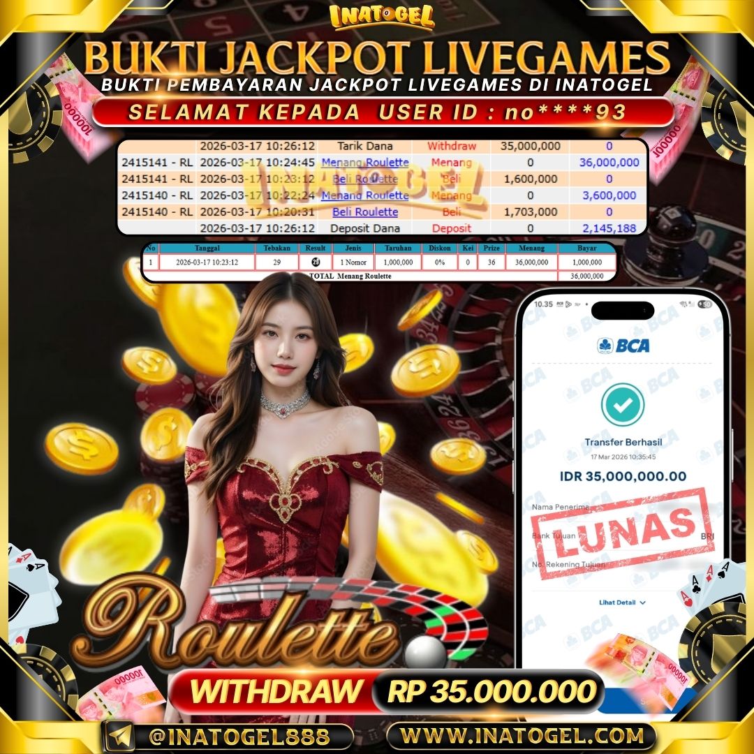 Selamat kepada User Id no****93 telah berhasil mendapatkan kemenangan jackpot pada permainan Live Games Roulet Inatogel sebesar Rp35,000,000 ,- . Inatogel situs terpercaya sejak dulu hingga saat ini , Untuk kemenangan berapapun pasti akan kami bayarkan . Jangan ragu bermain di Ina Togel . Kami pihak Inatogel Menyampaikan terima kasih kepada seluruh member Ina Togel yang telah Percaya dan setia Bersama kami bermain di Inatogel hingga saat ini.