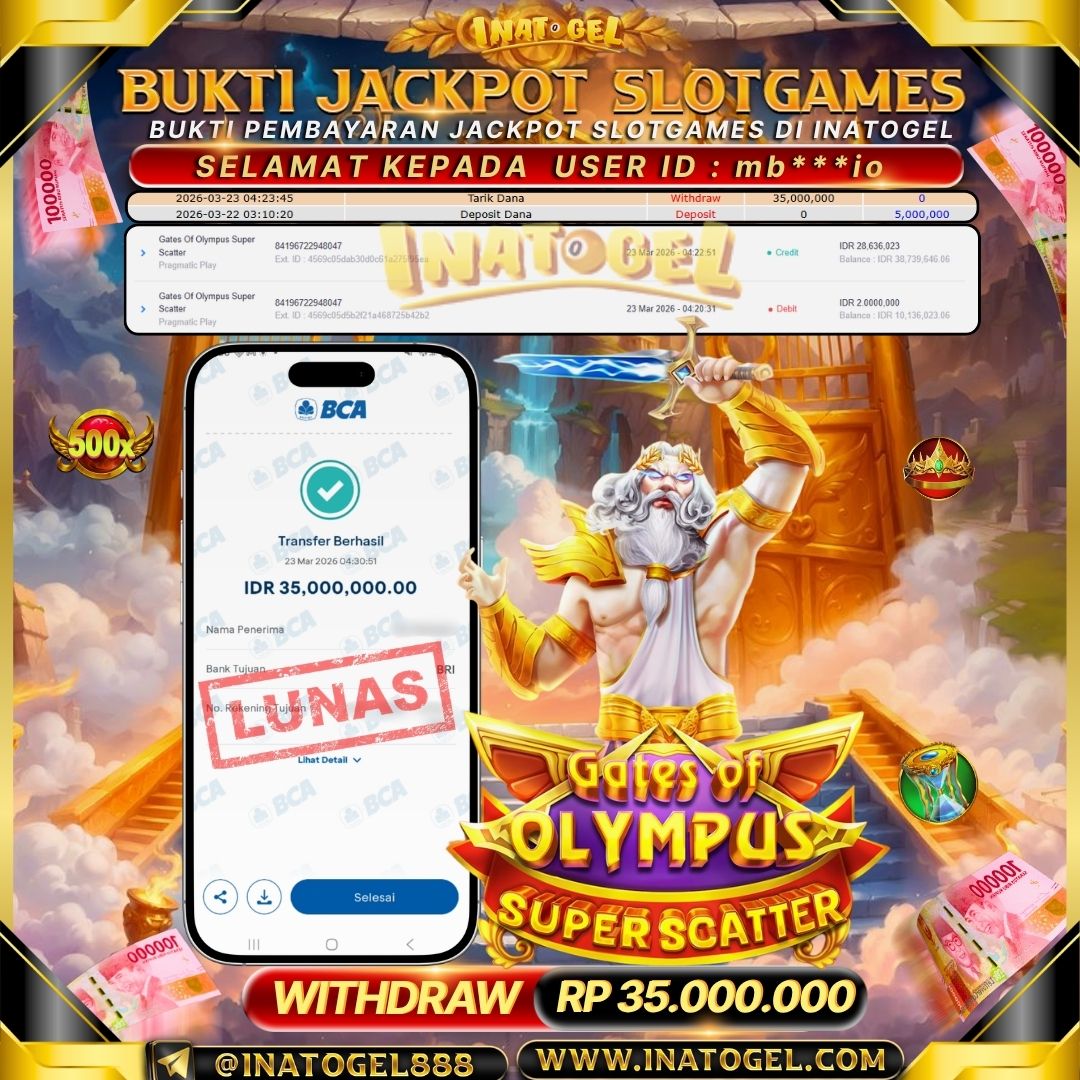 Selamat kepada User Id mb***io telah berhasil mendapatkan kemenangan jackpot pada permainan SlotGame Gates Of Olympus Super Scatter Inatogel sebesar Rp35,000,000,- . Inatogel situs terpercaya sejak dulu hingga saat ini , Untuk kemenangan berapapun pasti akan kami bayarkan . Jangan ragu bermain di Ina Togel . Kami pihak Inatogel Menyampaikan terima kasih kepada seluruh member Ina Togel yang telah Percaya dan setia Bersama kami bermain di Inatogel hingga saat ini.