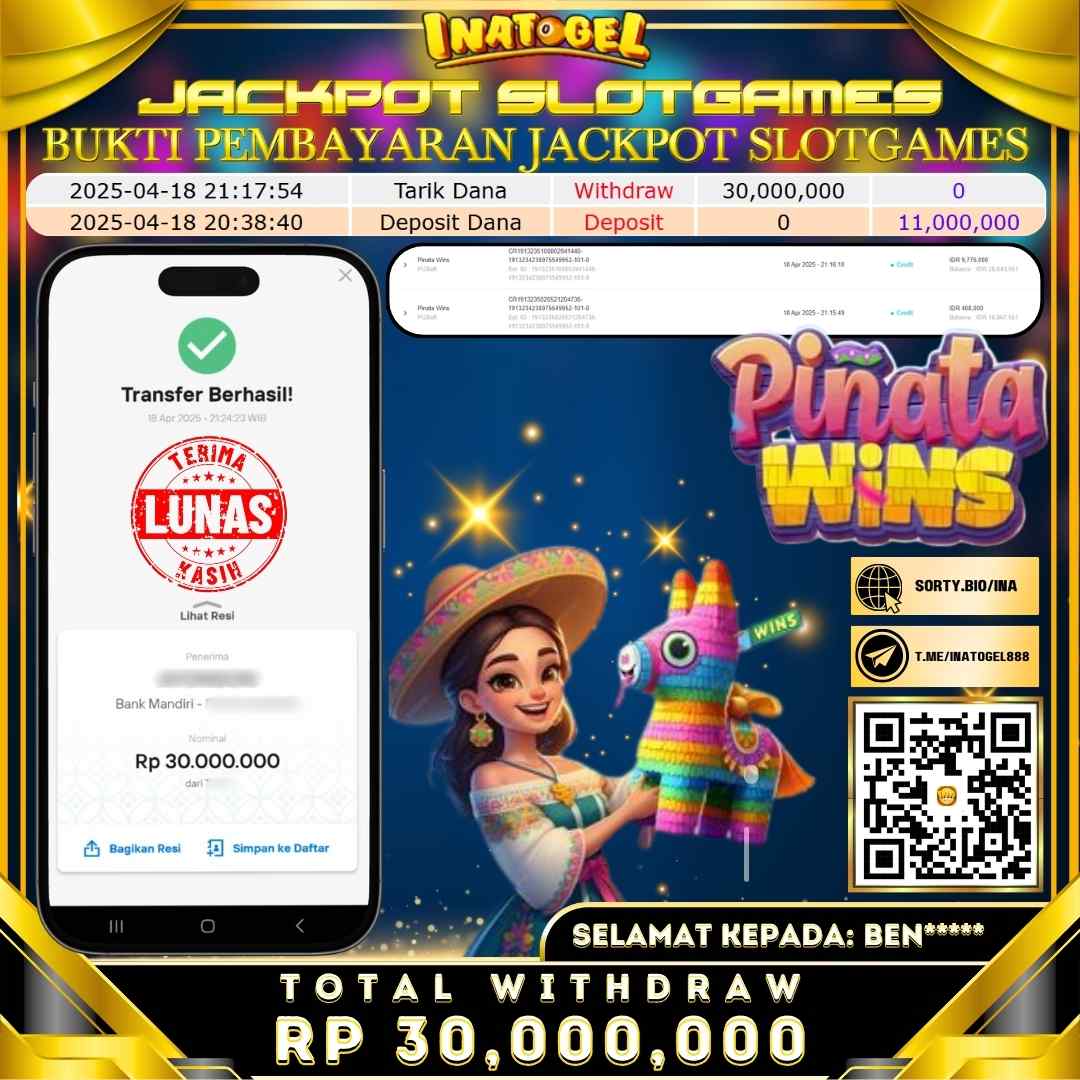 Selamat kepada UserId BEN***** telah berhasil mendapatkan kemenangan jackpot pada permainan Slot Game Pinata Wins Inatogel sebesar Rp30,000,000,- . Inatogel situs terpercaya sejak dulu hingga saat ini , Untuk kemenangan berapapun pasti akan kami bayarkan . Jangan ragu bermain di Ina Togel . Kami pihak Inatogel Menyampaikan terima kasih kepada seluruh member Ina Togel yang telah Percaya dan setia Bersama kami bermain di Inatogel hingga saat ini.