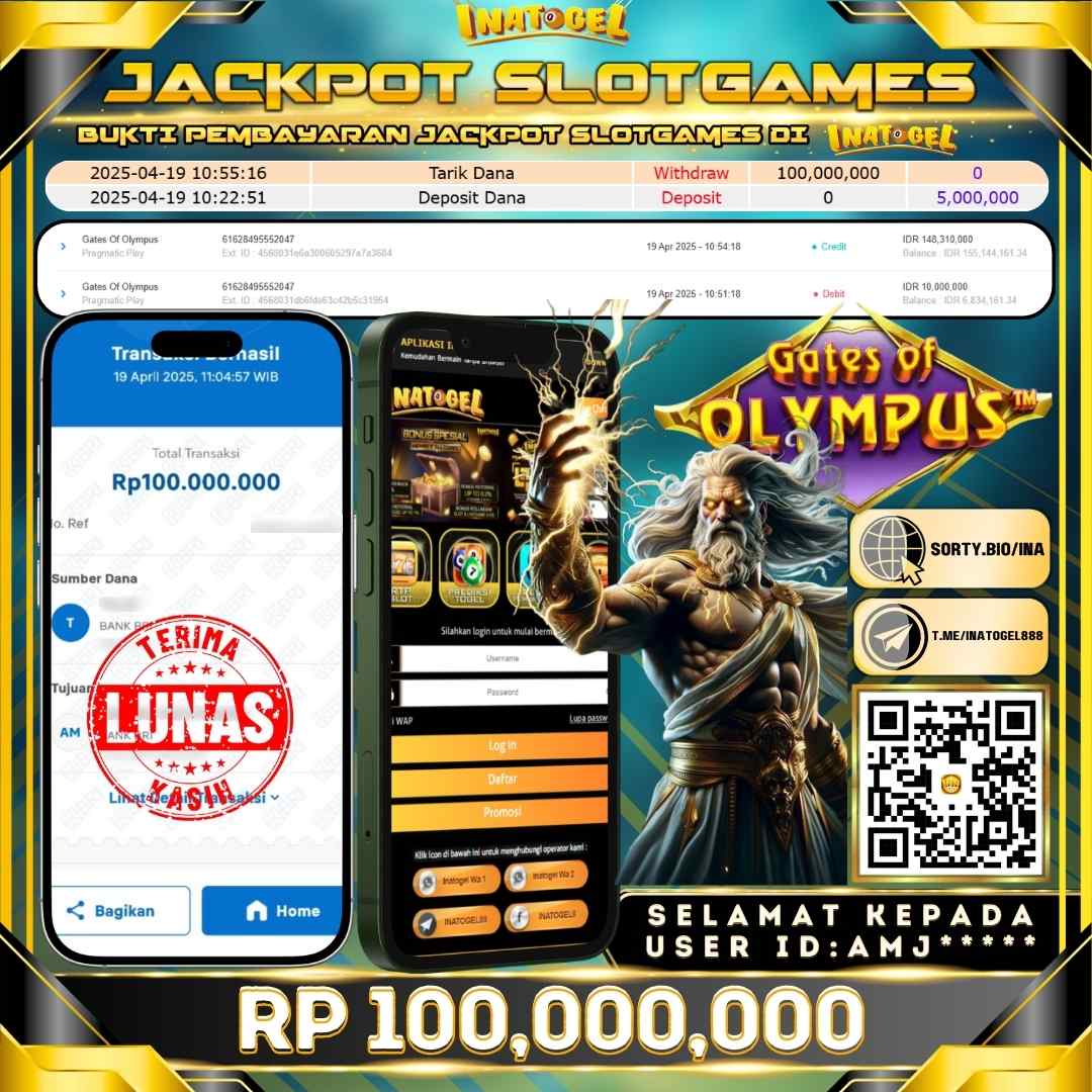 Selamat kepada UserId AMJ***** telah berhasil mendapatkan kemenangan jackpot pada permainan Slot Game Gates Of Olympus Inatogel sebesar Rp100,000,000,- . Inatogel situs terpercaya sejak dulu hingga saat ini , Untuk kemenangan berapapun pasti akan kami bayarkan . Jangan ragu bermain di Ina Togel . Kami pihak Inatogel Menyampaikan terima kasih kepada seluruh member Ina Togel yang telah Percaya dan setia Bersama kami bermain di Inatogel hingga saat ini.