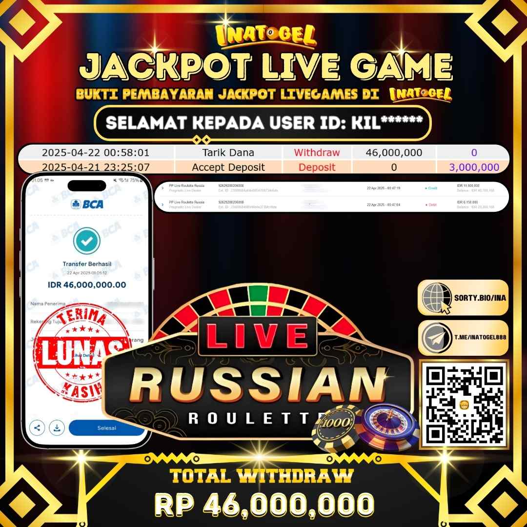 Selamat kepada UserId A**** telah berhasil mendapatkan kemenangan jackpot pada permainan LIVE GAME PP Live Roulette Russia Inatogel sebesar Rp46,000,000,- Inatogel situs terpercaya sejak dulu hingga saat ini , Untuk kemenangan berapapun pasti akan kami bayarkan . Jangan ragu bermain di Ina Togel . Kami pihak Inatogel Menyampaikan terima kasih kepada seluruh member Ina Togel yang telah Percaya dan setia Bersama kami bermain di Inatogel hingga saat ini.