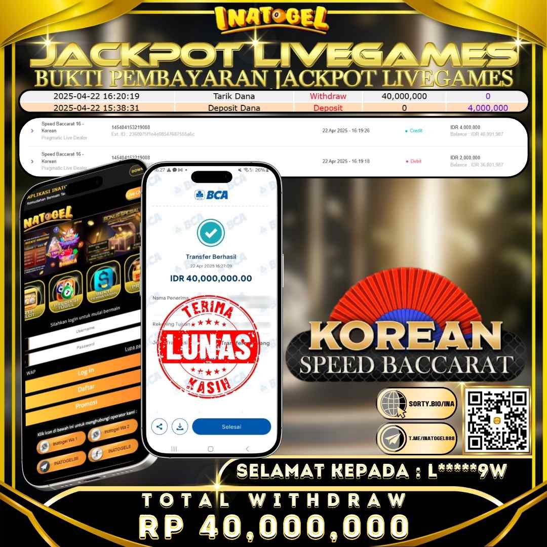 Selamat kepada UserId L*****9W telah berhasil mendapatkan kemenangan jackpot pada permainan LIVE GAME Speed Baccarat 16 - Korean Inatogel sebesar Rp40,000,000,- Inatogel situs terpercaya sejak dulu hingga saat ini , Untuk kemenangan berapapun pasti akan kami bayarkan . Jangan ragu bermain di Ina Togel . Kami pihak Inatogel Menyampaikan terima kasih kepada seluruh member Ina Togel yang telah Percaya dan setia Bersama kami bermain di Inatogel hingga saat ini.