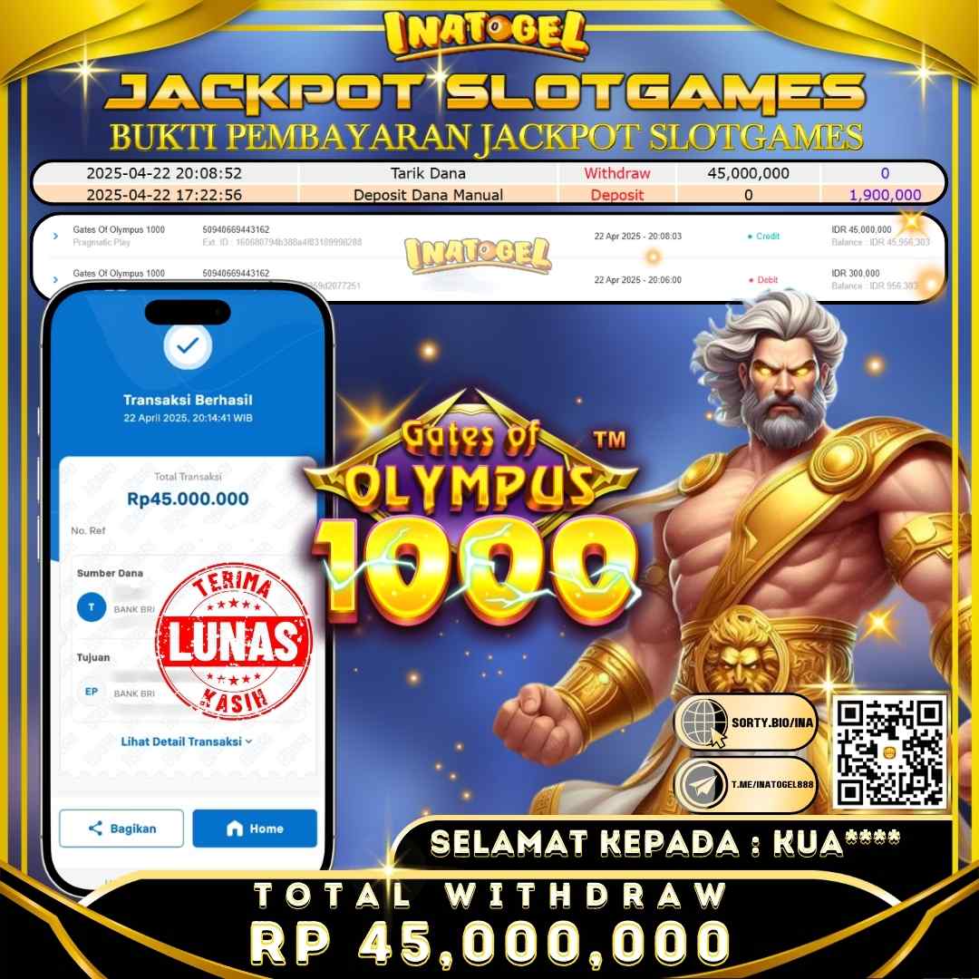 Selamat kepada UserId KUA**** telah berhasil mendapatkan kemenangan jackpot pada permainan Slot Game Gates Of Olympus 1000 Inatogel sebesar Rp45,000,000,- . Inatogel situs terpercaya sejak dulu hingga saat ini , Untuk kemenangan berapapun pasti akan kami bayarkan . Jangan ragu bermain di Ina Togel . Kami pihak Inatogel Menyampaikan terima kasih kepada seluruh member Ina Togel yang telah Percaya dan setia Bersama kami bermain di Inatogel hingga saat ini.