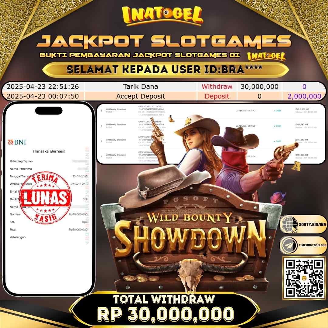 Selamat kepada UserId BRA**** telah berhasil mendapatkan kemenangan jackpot pada permainan SlotGame Wild Bounty Showdown Inatogel sebesar Rp30,000,000,- . Inatogel situs terpercaya sejak dulu hingga saat ini , Untuk kemenangan berapapun pasti akan kami bayarkan . Jangan ragu bermain di Ina Togel . Kami pihak Inatogel Menyampaikan terima kasih kepada seluruh member Ina Togel yang telah Percaya dan setia Bersama kami bermain di Inatogel hingga saat ini.