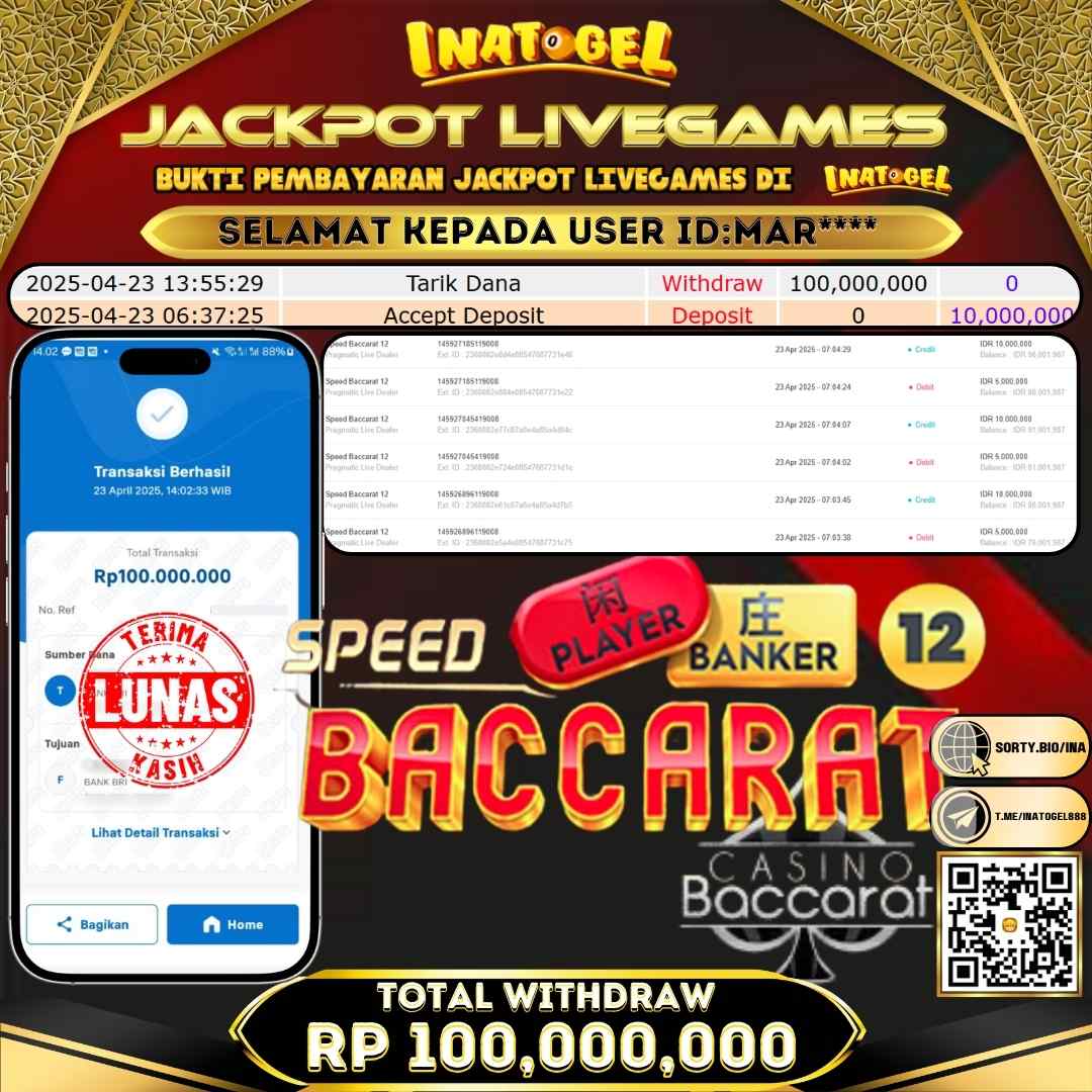 Selamat kepada UserId MAR**** telah berhasil mendapatkan kemenangan jackpot pada permainan LIVE GAME Speed Baccarat 12 Inatogel sebesar Rp100,000,000,- . Inatogel situs terpercaya sejak dulu hingga saat ini , Untuk kemenangan berapapun pasti akan kami bayarkan . Jangan ragu bermain di Ina Togel . Kami pihak Inatogel Menyampaikan terima kasih kepada seluruh member Ina Togel yang telah Percaya dan setia Bersama kami bermain di Inatogel hingga saat ini.