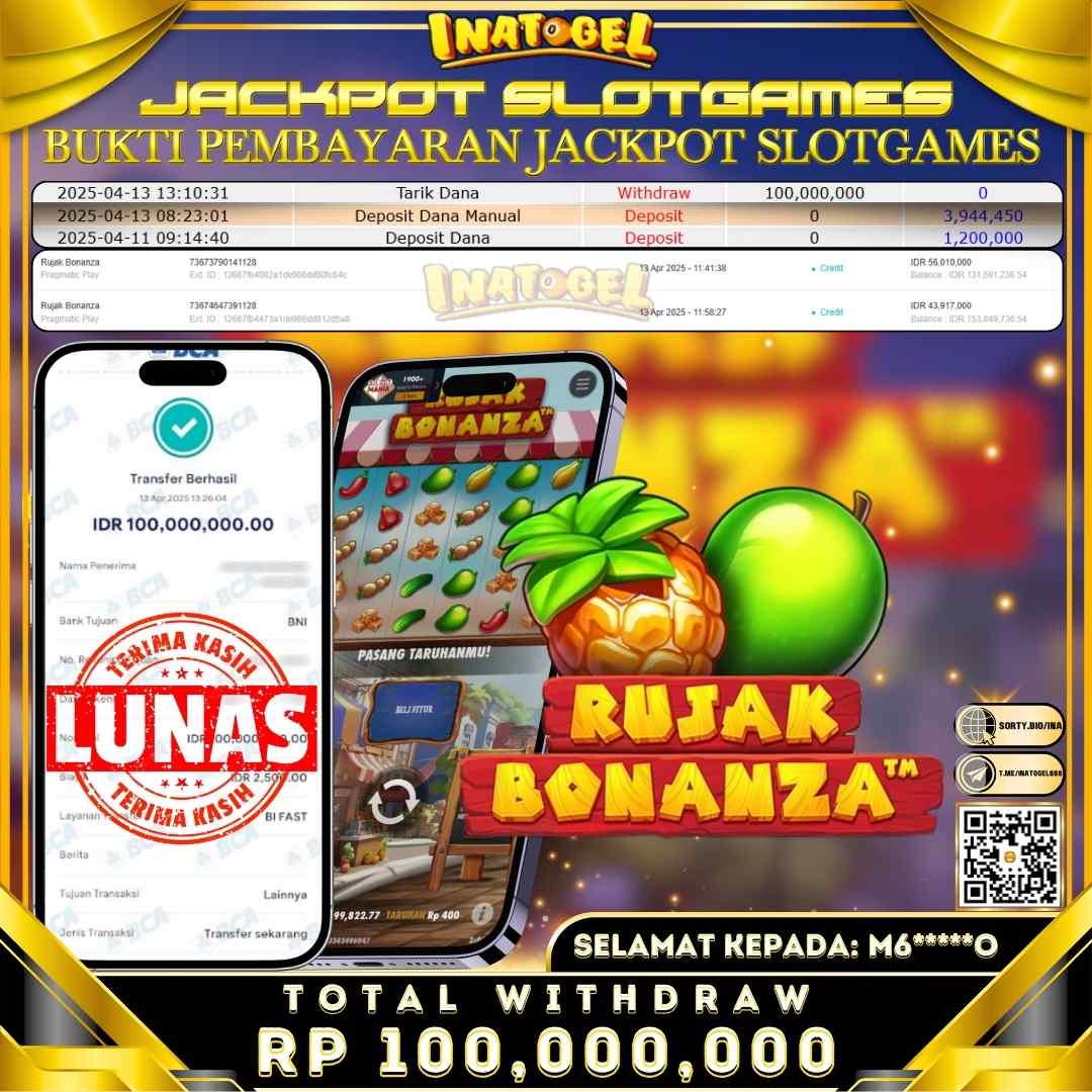 Selamat kepada UserId M6*****O telah berhasil mendapatkan kemenangan jackpot pada permainan Slot Game Rujak Bonanza Inatogel sebesar Rp100,000,000,- . Inatogel situs terpercaya sejak dulu hingga saat ini , Untuk kemenangan berapapun pasti akan kami bayarkan . Jangan ragu bermain di Ina Togel . Kami pihak Inatogel Menyampaikan terima kasih kepada seluruh member Ina Togel yang telah Percaya dan setia Bersama kami bermain di Inatogel hingga saat ini.