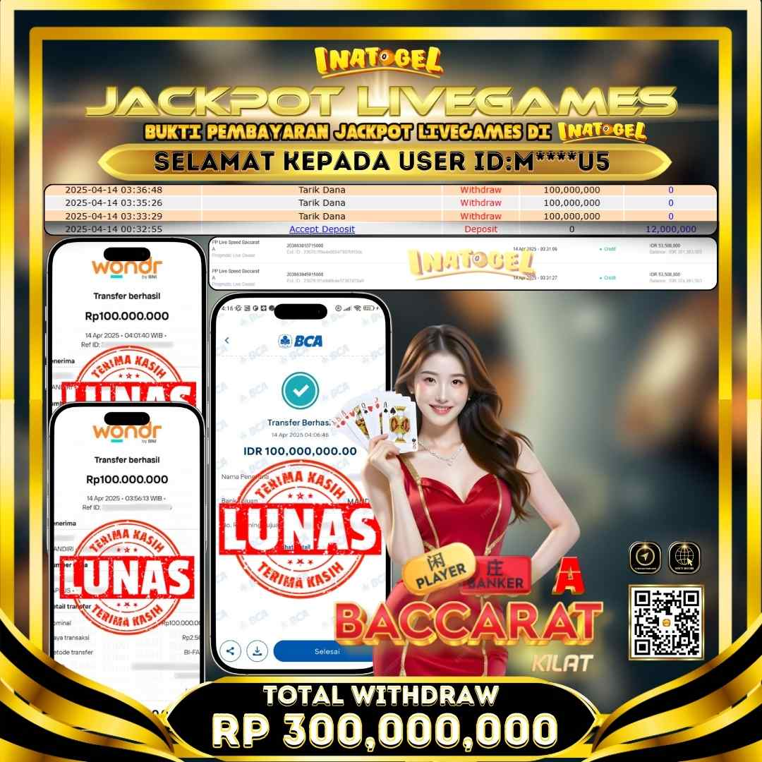 Selamat kepada UserId M****U5 telah berhasil mendapatkan kemenangan jackpot pada permainan Live Game PP Live Speed Baccarat A Inatogel sebesar Rp300,000,000,- . Inatogel situs terpercaya sejak dulu hingga saat ini , Untuk kemenangan berapapun pasti akan kami bayarkan . Jangan ragu bermain di Ina Togel . Kami pihak Inatogel Menyampaikan terima kasih kepada seluruh member Ina Togel yang telah Percaya dan setia Bersama kami bermain di Inatogel hingga saat ini.