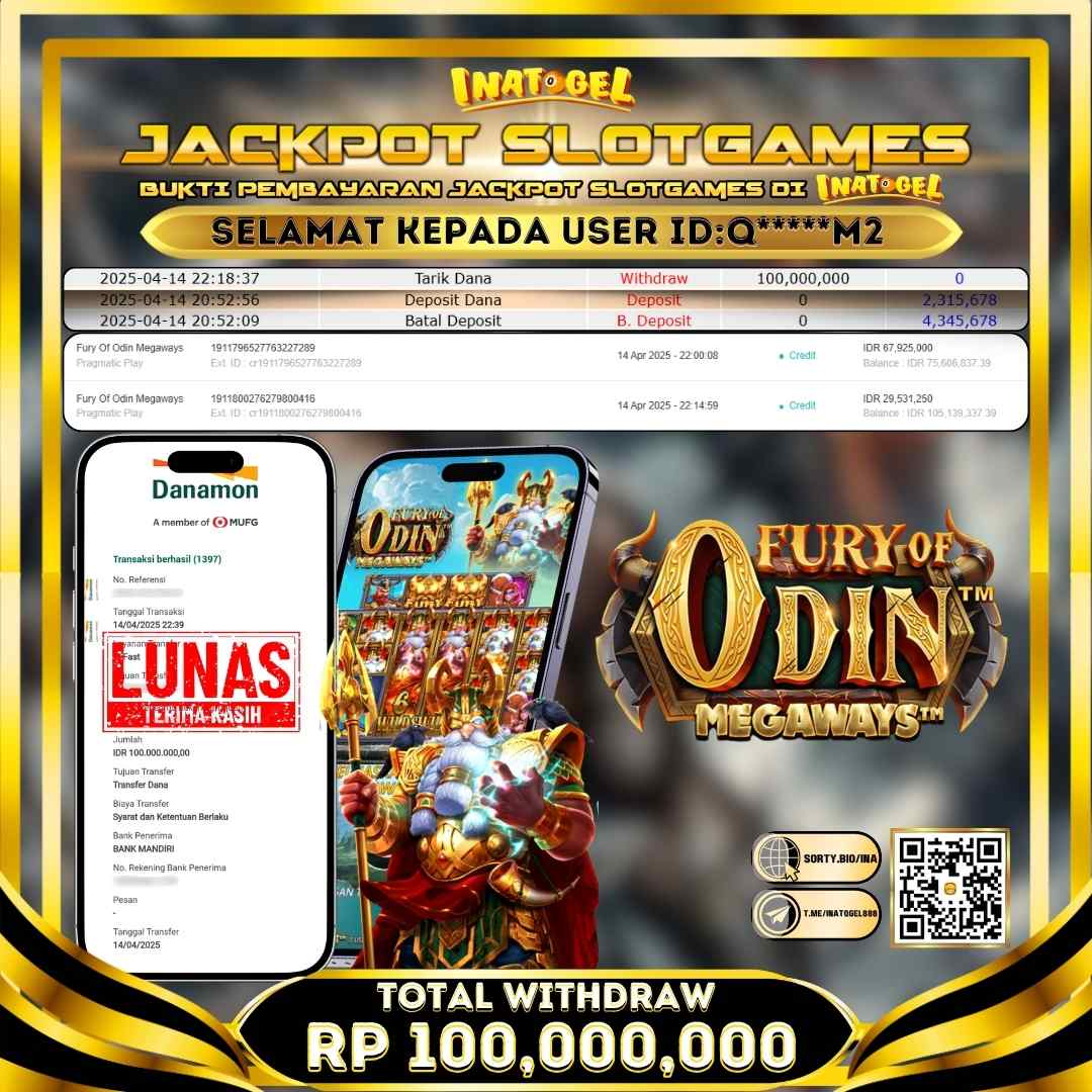 Selamat kepada UserId Q*****M2 telah berhasil mendapatkan kemenangan jackpot pada permainan Slot Game Fury Of Odin Megaways Inatogel sebesar Rp100,000,000,- . Inatogel situs terpercaya sejak dulu hingga saat ini , Untuk kemenangan berapapun pasti akan kami bayarkan . Jangan ragu bermain di Ina Togel . Kami pihak Inatogel Menyampaikan terima kasih kepada seluruh member Ina Togel yang telah Percaya dan setia Bersama kami bermain di Inatogel hingga saat ini.