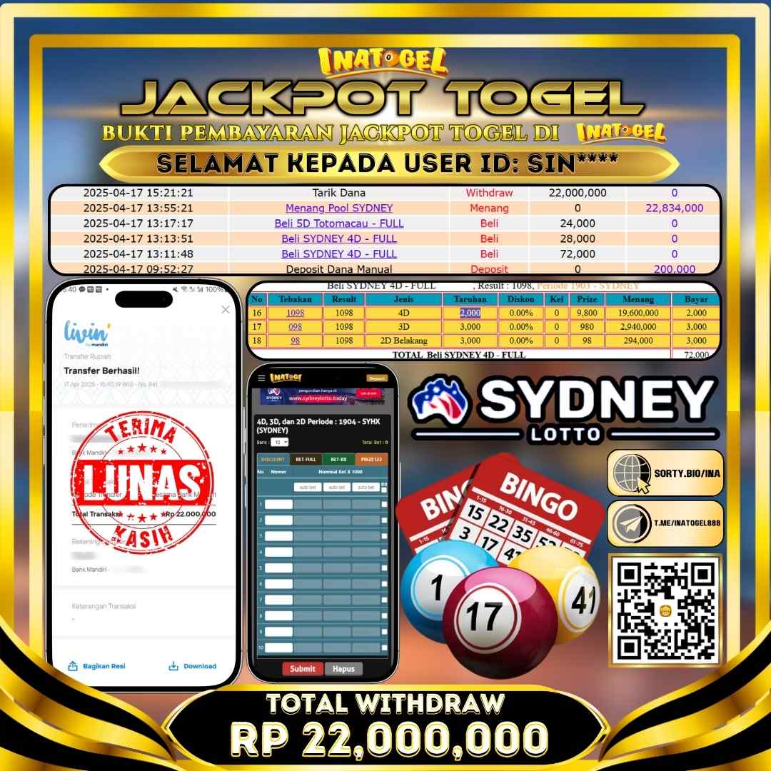 Inatogel Jackpot Togel SYDNEY LOTTO Rp22,000,000