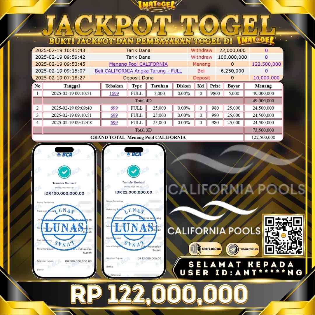Selamat kepada UserId ANT*****NG telah berhasil mendapatkan kemenangan jackpot pada permainan Togel California Inatogel sebesar Rp122,000,000,- . Inatogel situs terpercaya sejak dulu hingga saat ini , Untuk kemenangan berapapun pasti akan kami bayarkan, Jangan ragu bermain di Ina Togel, Kami pihak Inatogel menyampaikan terima kasih kepada seluruh member Ina Togel yang telah Percaya dan setia bersama kami bermain di Inatogel hingga saat ini.