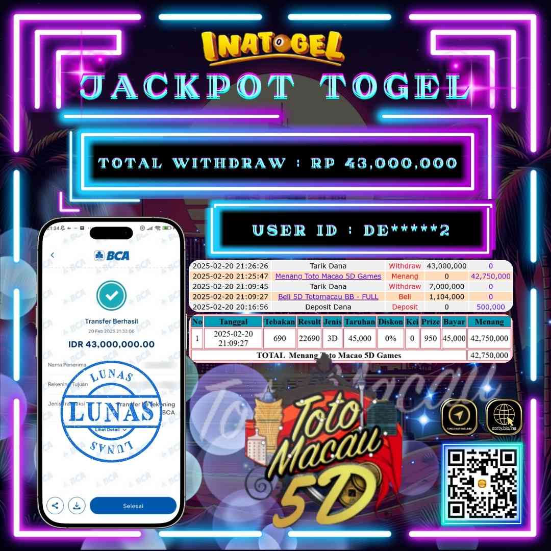 Inatogel Jackpot Togel Toto Macau 5D Rp43,000,000