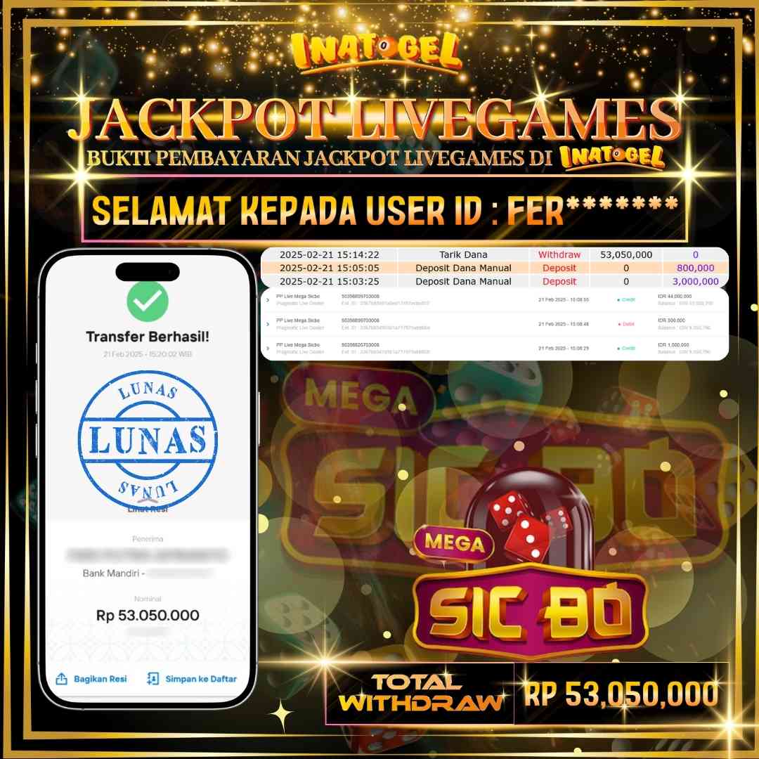 Inatogel Jackpot Live Game Mega Sicbo Rp53,050,000