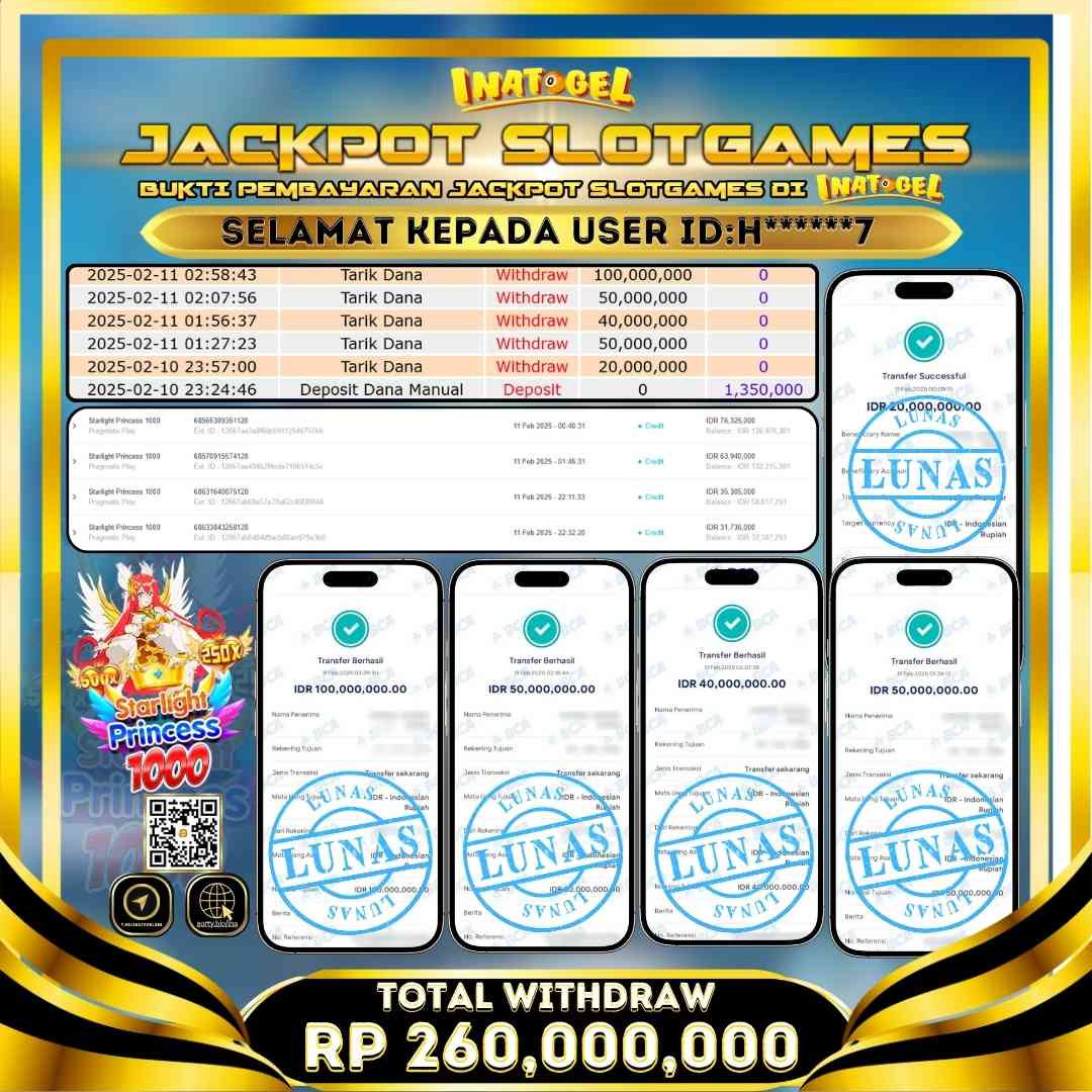 Selamat kepada UserId H*******7 telah berhasil mendapatkan kemenangan Jackpot pada permainan Slot Game Starlight Princess 1000 Inatogel sebesar Rp260,000,000,- . Inatogel situs terpercaya sejak dulu hingga saat ini , Untuk kemenangan berapapun pasti akan kami bayarkan . Jangan ragu bermain di Ina Togel . Kami pihak Inatogel Menyampaikan terima kasih kepada seluruh member Ina Togel yang telah Percaya dan setia Bersama kami bermain di Inatogel hingga saat ini.
