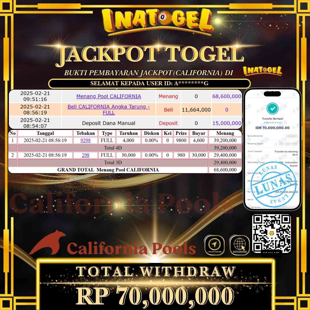 Selamat kepada UserId A********G telah berhasil mendapatkan kemenangan jackpot pada permainan Togel California Inatogel sebesar Rp70,000,000,- . Inatogel situs terpercaya sejak dulu hingga saat ini , Untuk kemenangan berapapun pasti akan kami bayarkan, Jangan ragu bermain di Ina Togel, Kami pihak Inatogel menyampaikan terima kasih kepada seluruh member Ina Togel yang telah Percaya dan setia bersama kami bermain di Inatogel hingga saat ini.