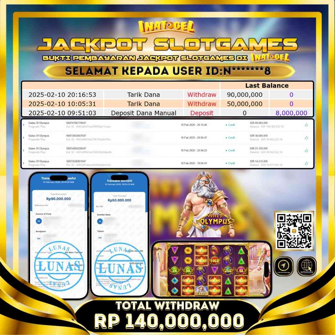 Inatogel Jackpot Slot Game Gates Of Olympus Rp140,000,000