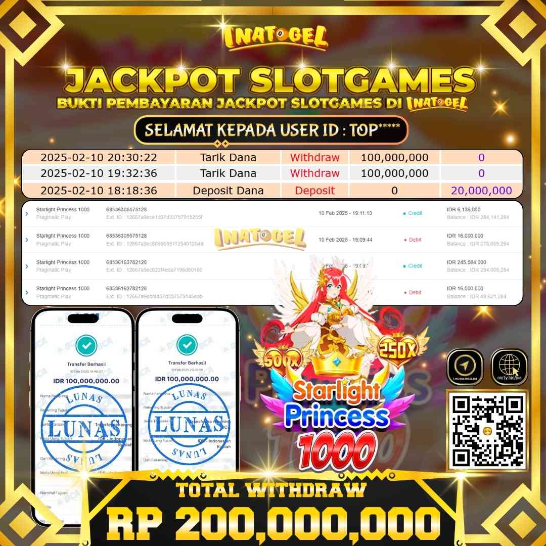 Selamat kepada UserId TOP******* telah berhasil mendapatkan kemenangan Jackpot pada permainan Slot Game Starlight Princess 1000 Inatogel sebesar Rp200,000,000,- . Inatogel situs terpercaya sejak dulu hingga saat ini , Untuk kemenangan berapapun pasti akan kami bayarkan . Jangan ragu bermain di Ina Togel . Kami pihak Inatogel Menyampaikan terima kasih kepada seluruh member Ina Togel yang telah Percaya dan setia Bersama kami bermain di Inatogel hingga saat ini.