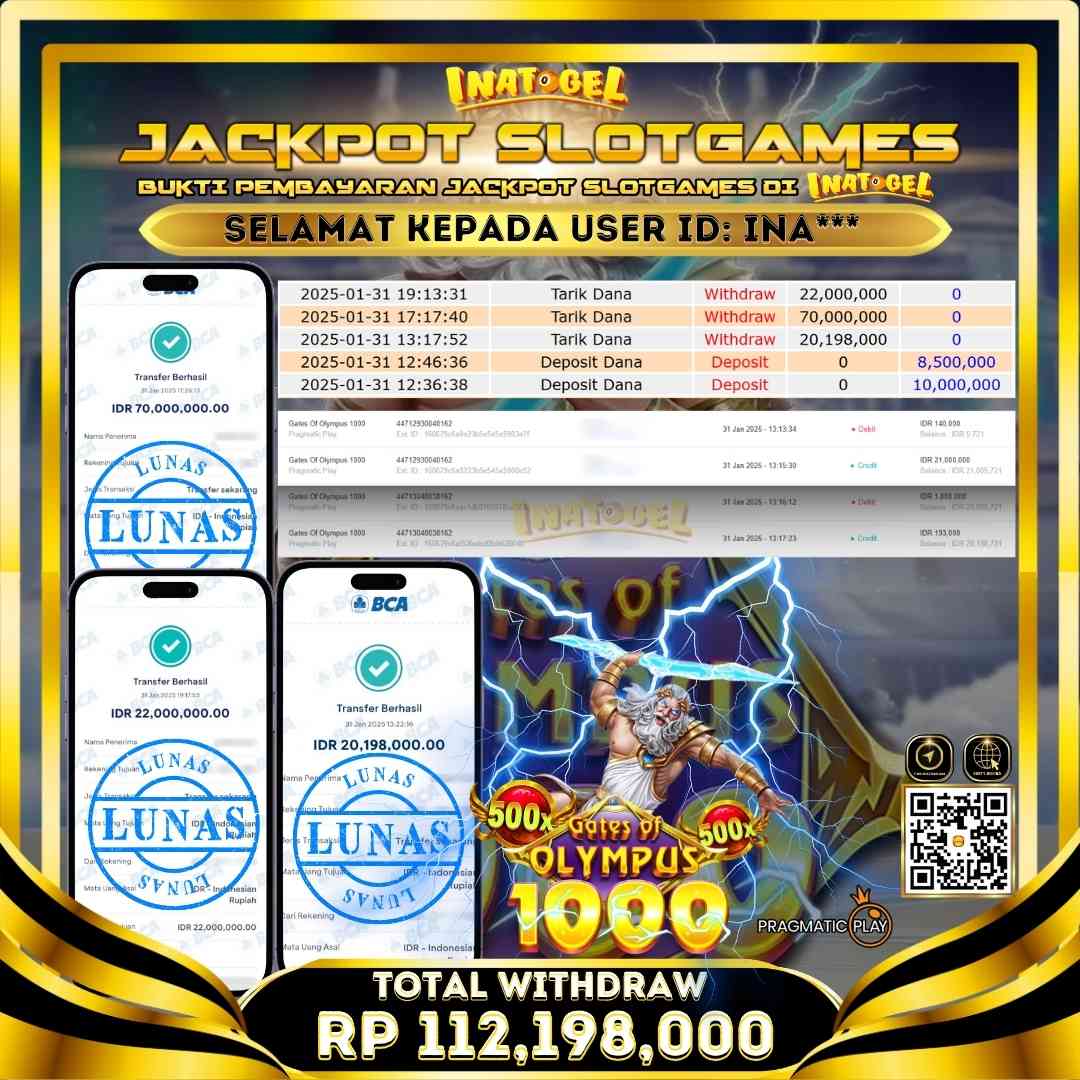 Selamat kepada UserId INA*** telah berhasil mendapatkan kemenangan jackpot pada permainan Slot Game Gates Of Olympus 1000 Inatogel sebesar Rp112,198,000,- . Inatogel situs terpercaya sejak dulu hingga saat ini , Untuk kemenangan berapapun pasti akan kami bayarkan . Jangan ragu bermain di Ina Togel . Kami pihak Inatogel Menyampaikan terima kasih kepada seluruh member Ina Togel yang telah Percaya dan setia Bersama kami bermain di Inatogel hingga saat ini.
