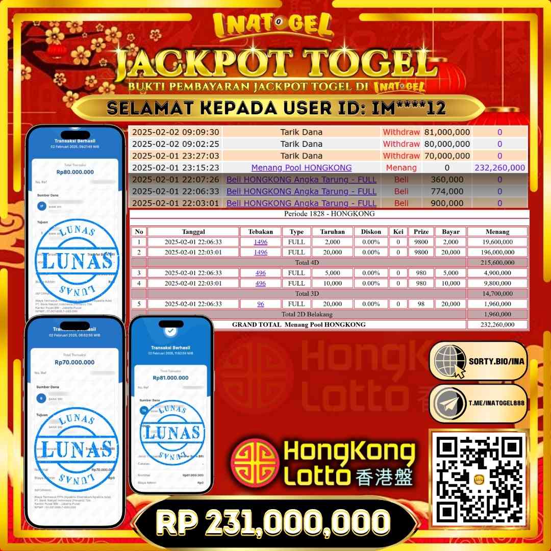 Inatogel Jackpot Togel Hongkong Lotto Rp231,000,000