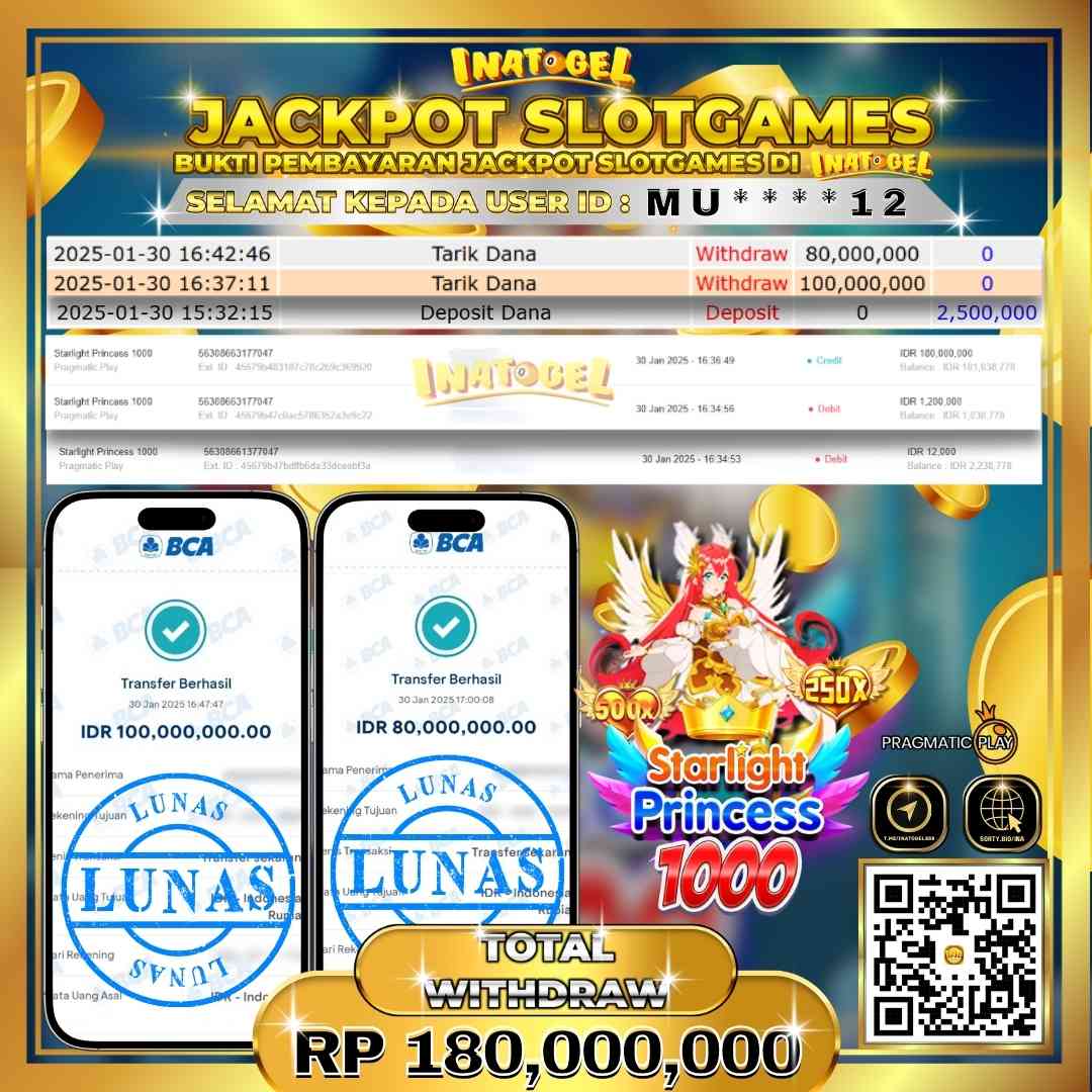 Selamat kepada UserId MU****12 telah berhasil mendapatkan kemenangan Jackpot pada permainan Slot Game Starlight Princess 1000 Inatogel sebesar Rp180,000,000,- . Inatogel situs terpercaya sejak dulu hingga saat ini , Untuk kemenangan berapapun pasti akan kami bayarkan . Jangan ragu bermain di Ina Togel . Kami pihak Inatogel Menyampaikan terima kasih kepada seluruh member Ina Togel yang telah Percaya dan setia Bersama kami bermain di Inatogel hingga saat ini.