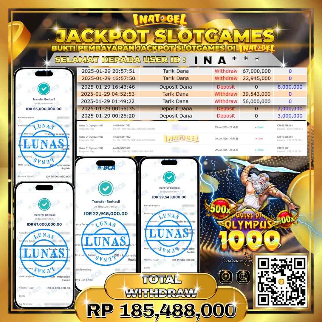 Selamat kepada UserId INA*** telah berhasil mendapatkan kemenangan jackpot pada permainan Slot Game Gates Of Olympus 1000 Inatogel sebesar Rp185,488,000,- . Inatogel situs terpercaya sejak dulu hingga saat ini , Untuk kemenangan berapapun pasti akan kami bayarkan . Jangan ragu bermain di Ina Togel . Kami pihak Inatogel Menyampaikan terima kasih kepada seluruh member Ina Togel yang telah Percaya dan setia Bersama kami bermain di Inatogel hingga saat ini.