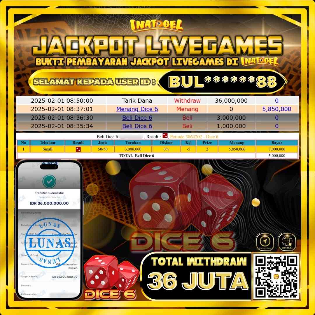 Inatogel Jackpot Live Game Dice 6 Rp36,000,000