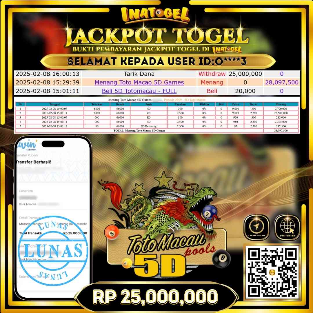 Inatogel Jackpot Togel Toto Macau 5D Rp25,000,000