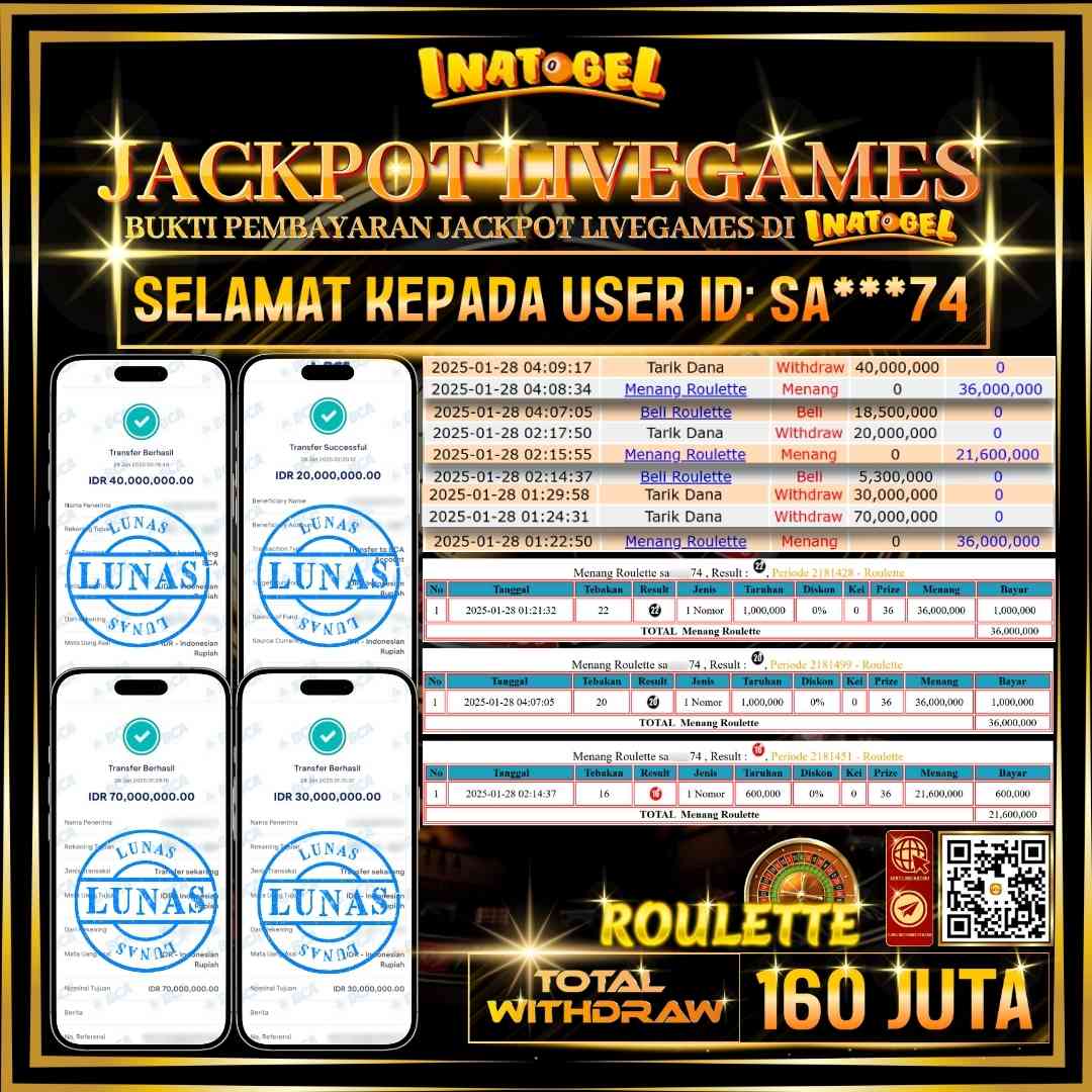 Selamat kepada UserId SA***74 telah berhasil mendapatkan kemenangan jackpot pada permainan Live Game Roulette Inatogel sebesar Rp160,000,000,- . Inatogel situs terpercaya sejak dulu hingga saat ini , Untuk kemenangan berapapun pasti akan kami bayarkan . Jangan ragu bermain di Ina Togel . Kami pihak Inatogel Menyampaikan terima kasih kepada seluruh member Ina Togel yang telah Percaya dan setia Bersama kami bermain di Inatogel hingga saat ini.