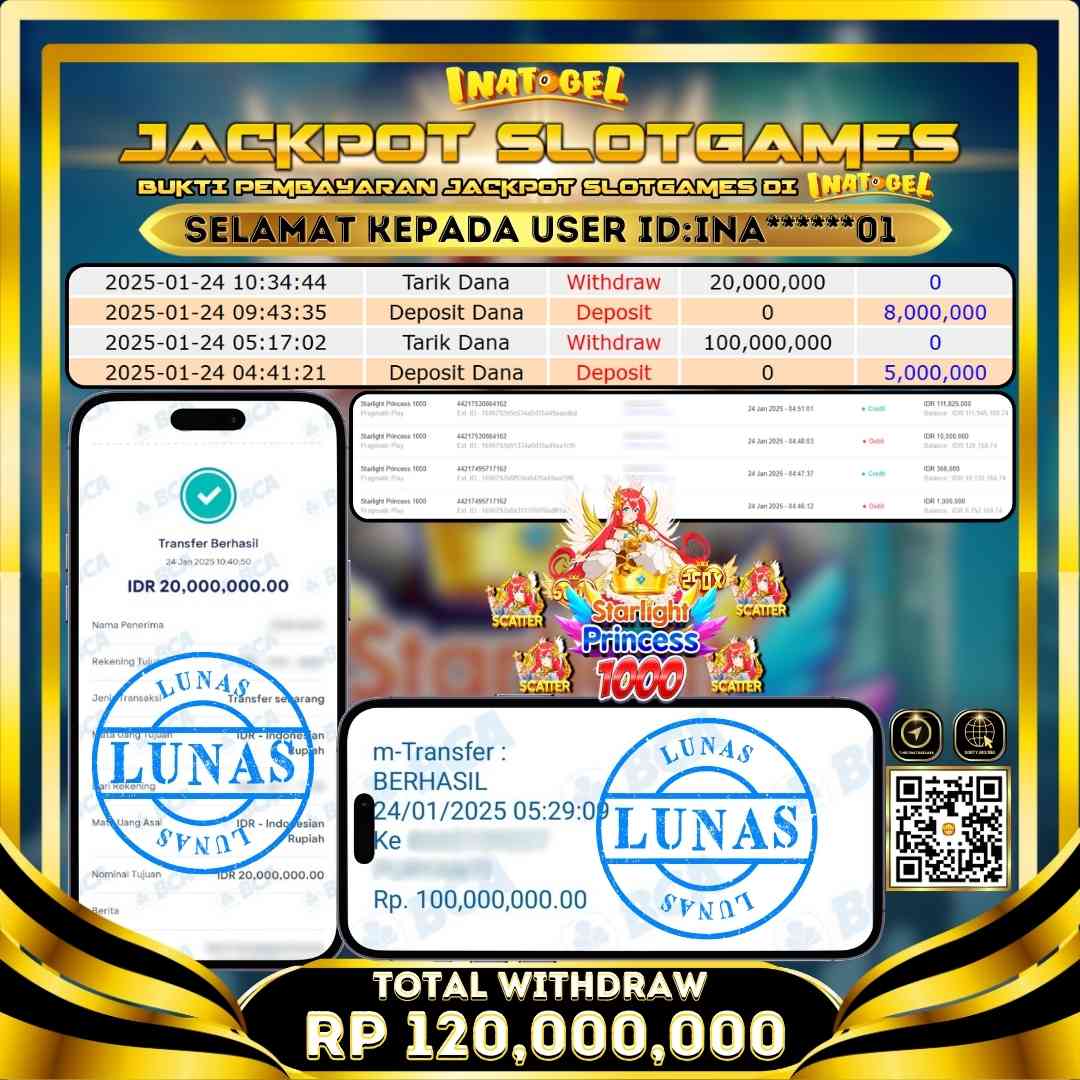 Selamat kepada UserId INA******01 telah berhasil mendapatkan kemenangan Jackpot pada permainan Slot Game Starlight Princess 1000 Inatogel sebesar Rp120,000,000,- . Inatogel situs terpercaya sejak dulu hingga saat ini , Untuk kemenangan berapapun pasti akan kami bayarkan . Jangan ragu bermain di Ina Togel . Kami pihak Inatogel Menyampaikan terima kasih kepada seluruh member Ina Togel yang telah Percaya dan setia Bersama kami bermain di Inatogel hingga saat ini.