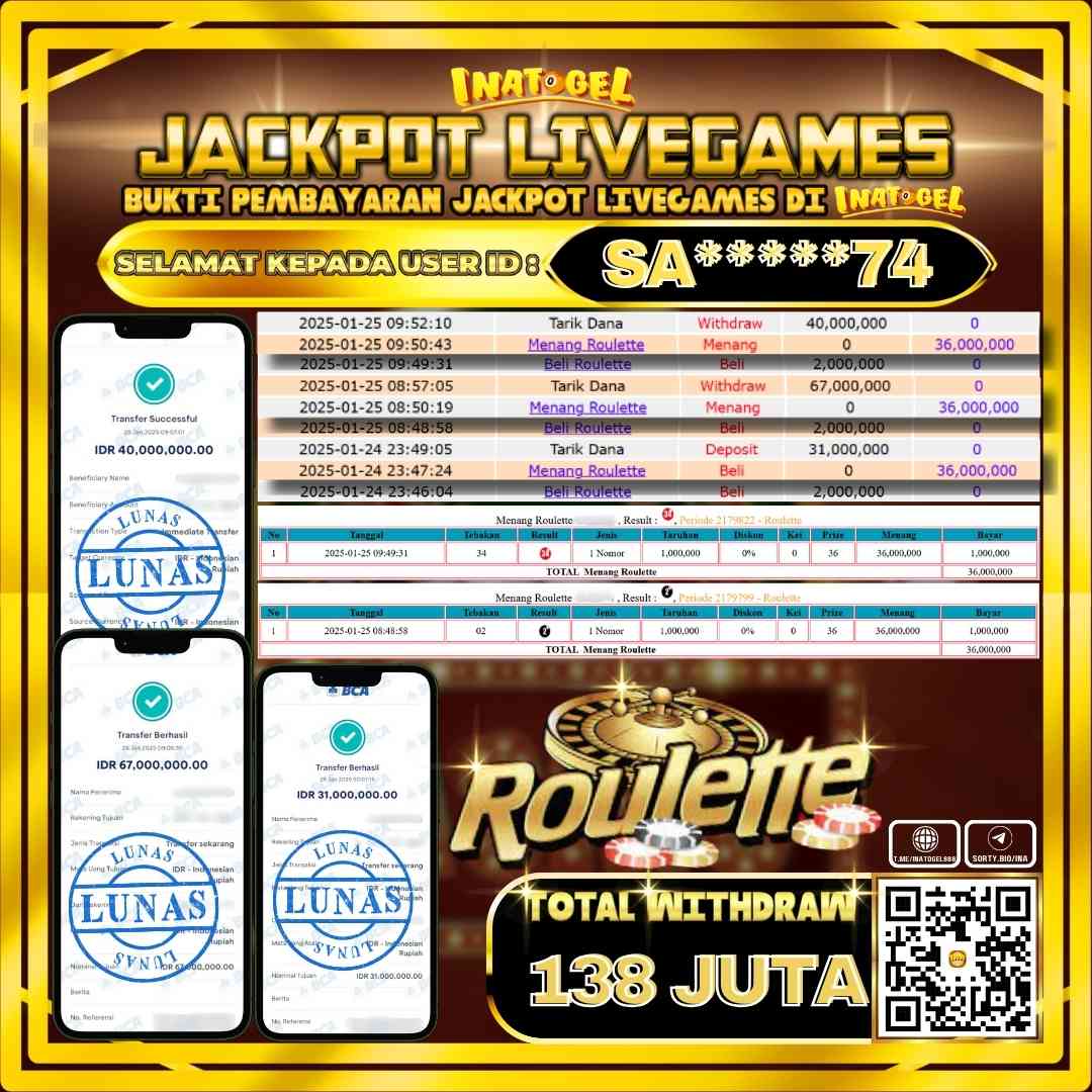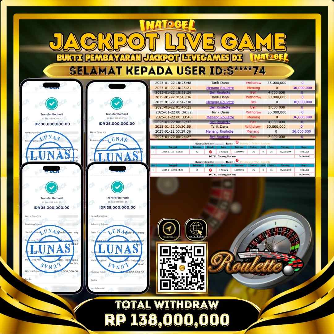 Selamat kepada UserId S****74 telah berhasil mendapatkan kemenangan jackpot pada permainan Live Game Roulette Inatogel sebesar Rp138,000,000,- . Inatogel situs terpercaya sejak dulu hingga saat ini , Untuk kemenangan berapapun pasti akan kami bayarkan . Jangan ragu bermain di Ina Togel . Kami pihak Inatogel Menyampaikan terima kasih kepada seluruh member Ina Togel yang telah Percaya dan setia Bersama kami bermain di Inatogel hingga saat ini.