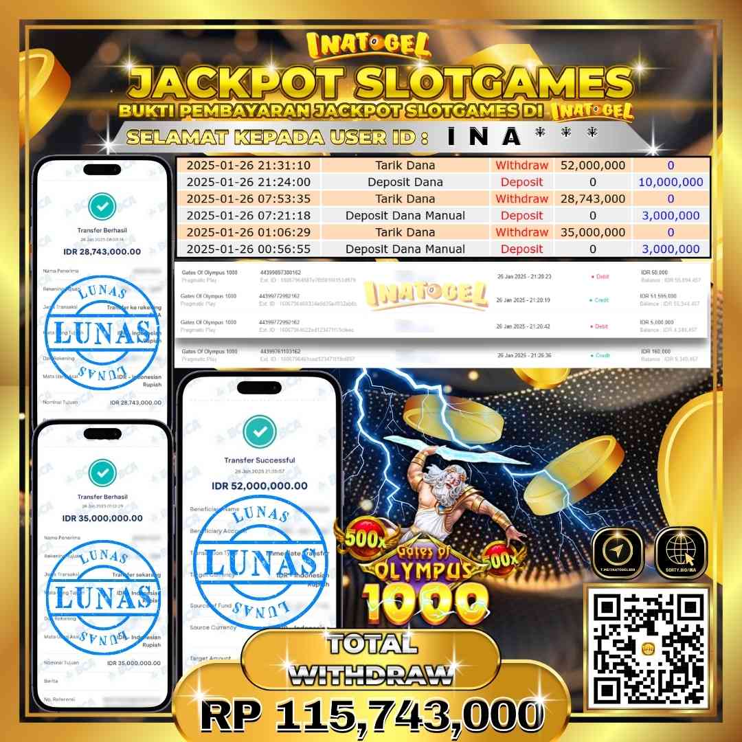 Selamat kepada UserId INA*** telah berhasil mendapatkan kemenangan jackpot pada permainan Slot Game Gates Of Olympus 1000 Inatogel sebesar Rp115,743,000,- . Inatogel situs terpercaya sejak dulu hingga saat ini , Untuk kemenangan berapapun pasti akan kami bayarkan . Jangan ragu bermain di Ina Togel . Kami pihak Inatogel Menyampaikan terima kasih kepada seluruh member Ina Togel yang telah Percaya dan setia Bersama kami bermain di Inatogel hingga saat ini.