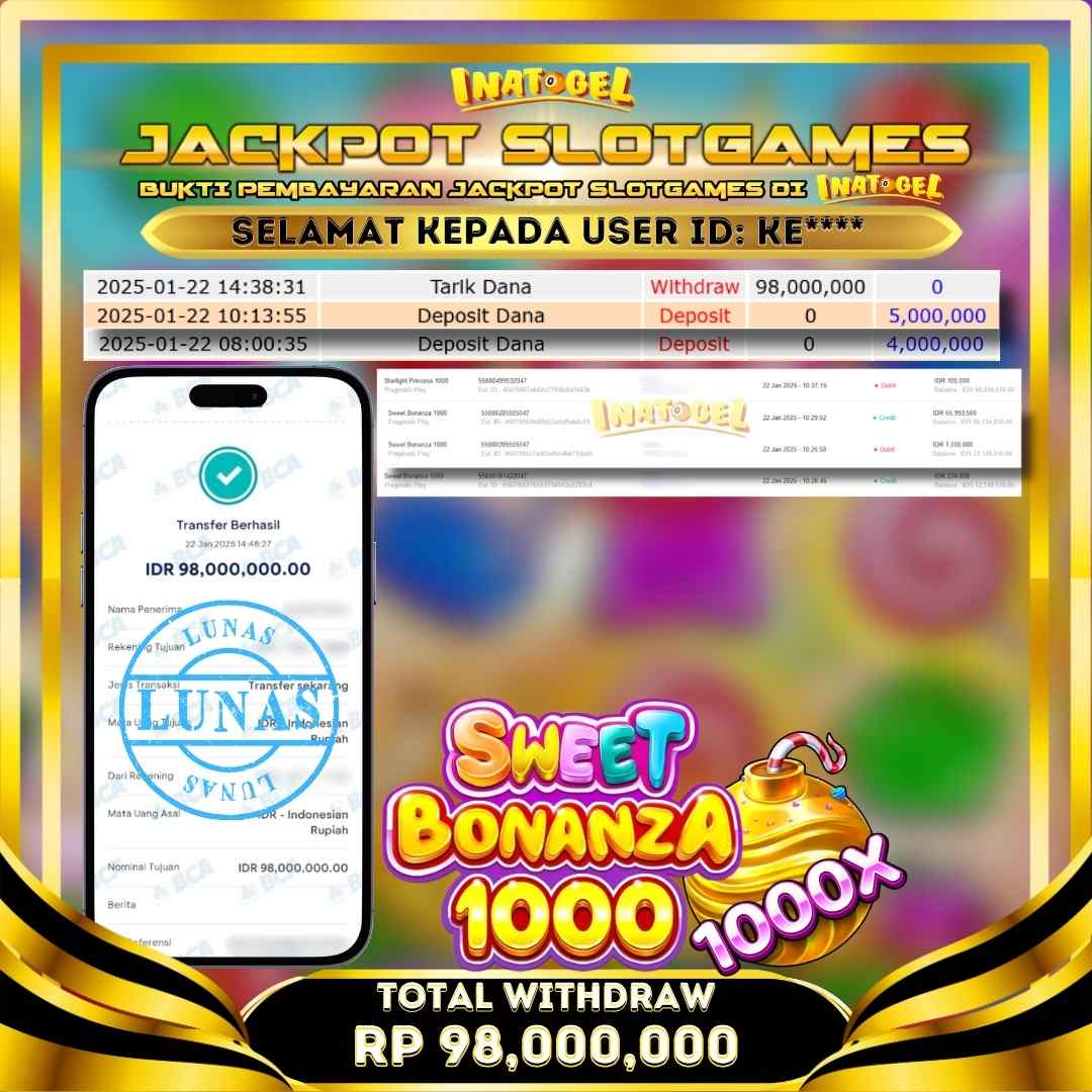 Selamat kepada UserId KE**** telah berhasil mendapatkan kemenangan jackpot pada permainan Slot Game Sweet Bonanza 1000 Inatogel sebesar Rp98,000,000,- . Inatogel situs terpercaya sejak dulu hingga saat ini , Untuk kemenangan berapapun pasti akan kami bayarkan . Jangan ragu bermain di Ina Togel . Kami pihak Inatogel Menyampaikan terima kasih kepada seluruh member Ina Togel yang telah Percaya dan setia Bersama kami bermain di Inatogel hingga saat ini.