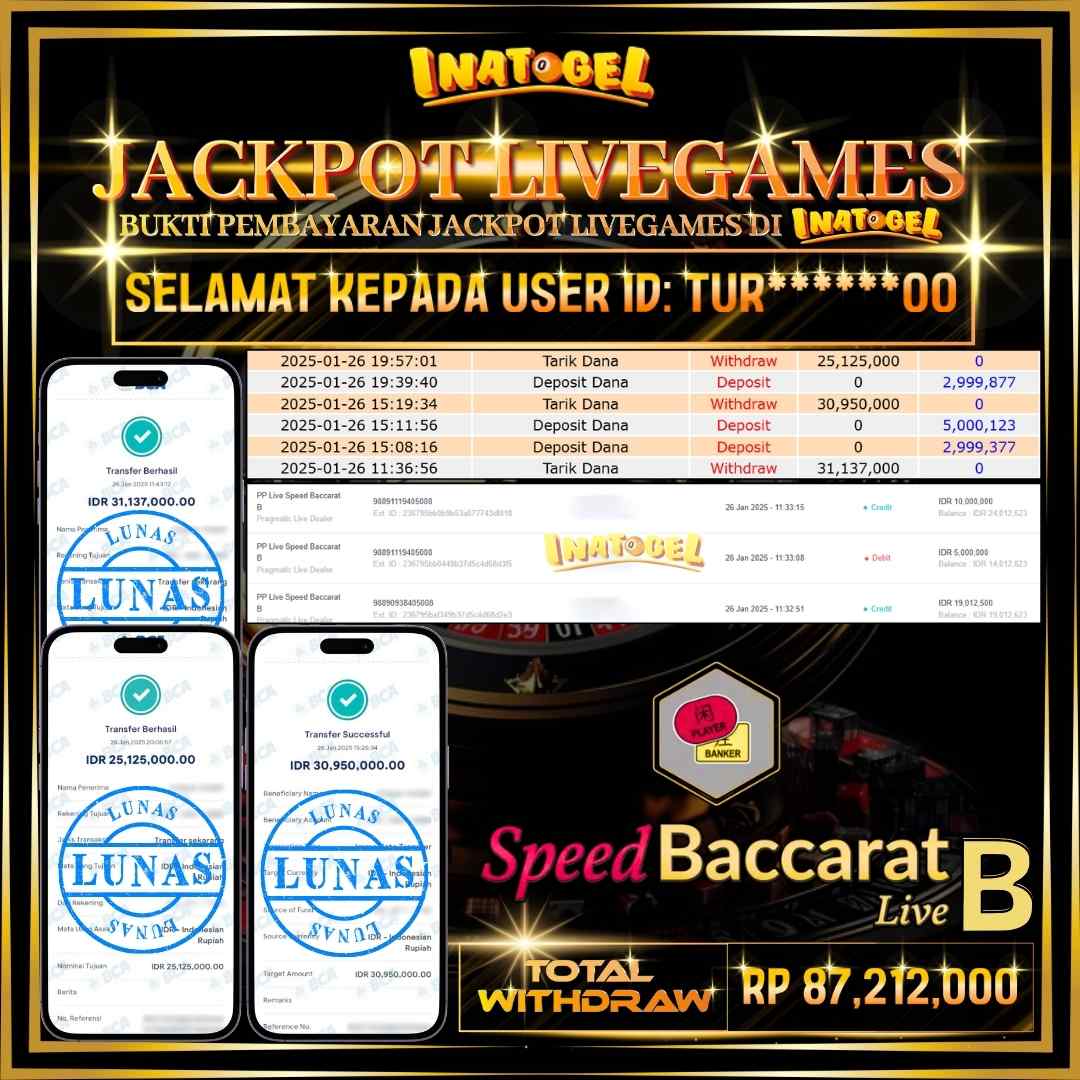 Selamat kepada UserId MUS***25 telah berhasil mendapatkan kemenangan jackpot pada permainan Live Game PP Live Speed Baccarat A Inatogel sebesar Rp30,057,000,- . Inatogel situs terpercaya sejak dulu hingga saat ini , Untuk kemenangan berapapun pasti akan kami bayarkan . Jangan ragu bermain di Ina Togel . Kami pihak Inatogel Menyampaikan terima kasih kepada seluruh member Ina Togel yang telah Percaya dan setia Bersama kami bermain di Inatogel hingga saat ini.