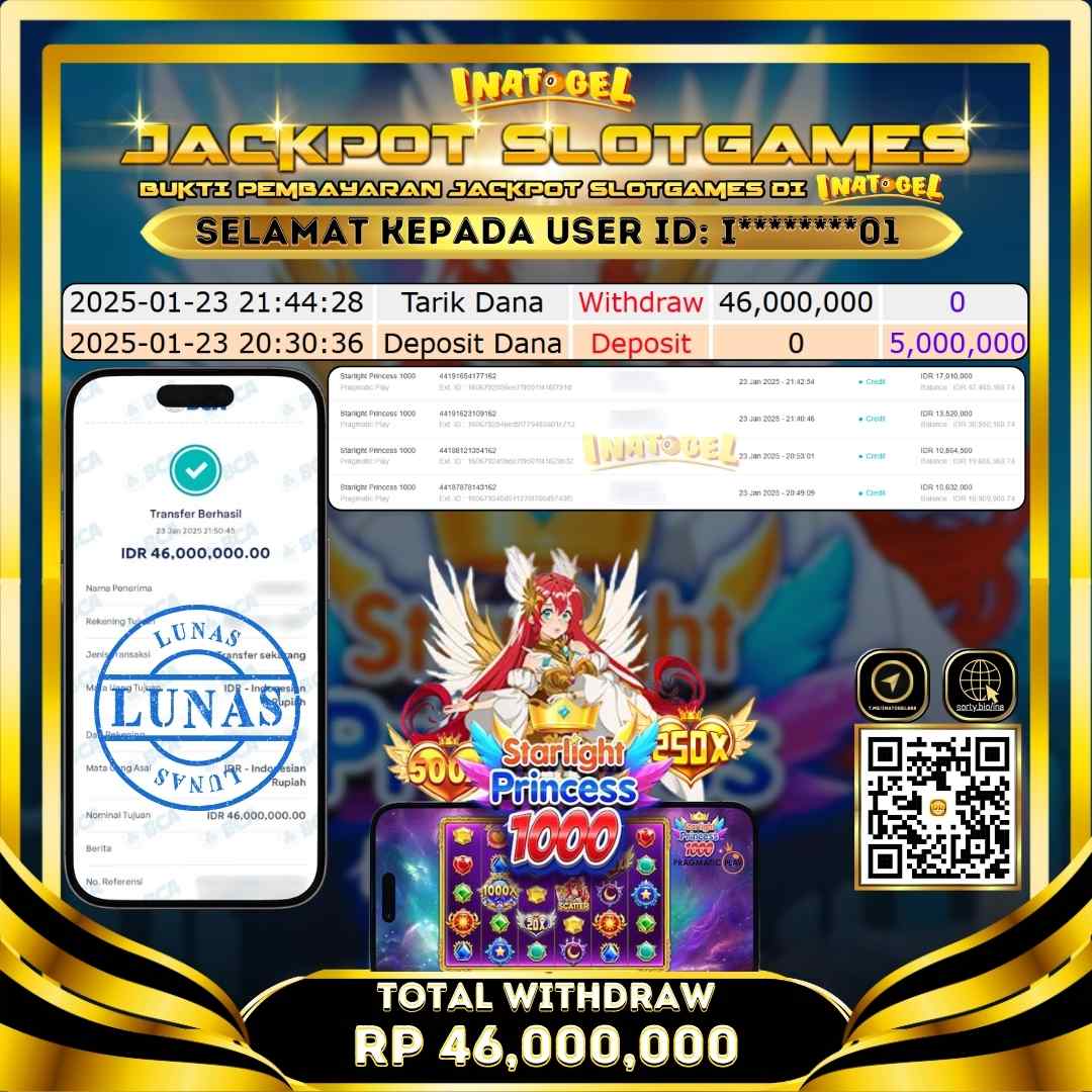 Selamat kepada UserId I********01 telah berhasil mendapatkan kemenangan Jackpot pada permainan Slot Game Starlight Princess 1000 Inatogel sebesar Rp46,000,000,- . Inatogel situs terpercaya sejak dulu hingga saat ini , Untuk kemenangan berapapun pasti akan kami bayarkan . Jangan ragu bermain di Ina Togel . Kami pihak Inatogel Menyampaikan terima kasih kepada seluruh member Ina Togel yang telah Percaya dan setia Bersama kami bermain di Inatogel hingga saat ini.