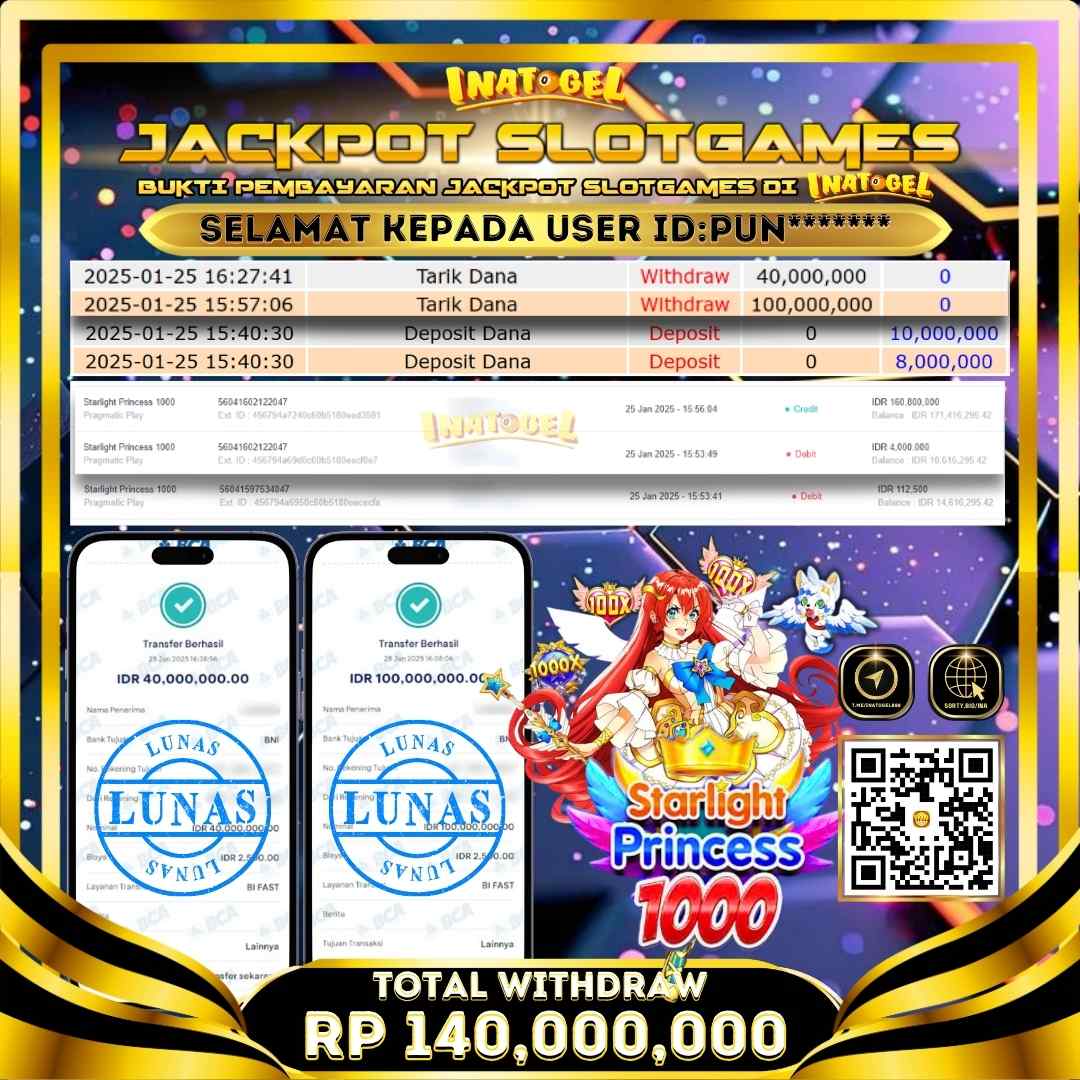 Selamat kepada UserId PUN******* telah berhasil mendapatkan kemenangan Jackpot pada permainan Slot Game Starlight Princess 1000 Inatogel sebesar Rp140,000,000,- . Inatogel situs terpercaya sejak dulu hingga saat ini , Untuk kemenangan berapapun pasti akan kami bayarkan . Jangan ragu bermain di Ina Togel . Kami pihak Inatogel Menyampaikan terima kasih kepada seluruh member Ina Togel yang telah Percaya dan setia Bersama kami bermain di Inatogel hingga saat ini.