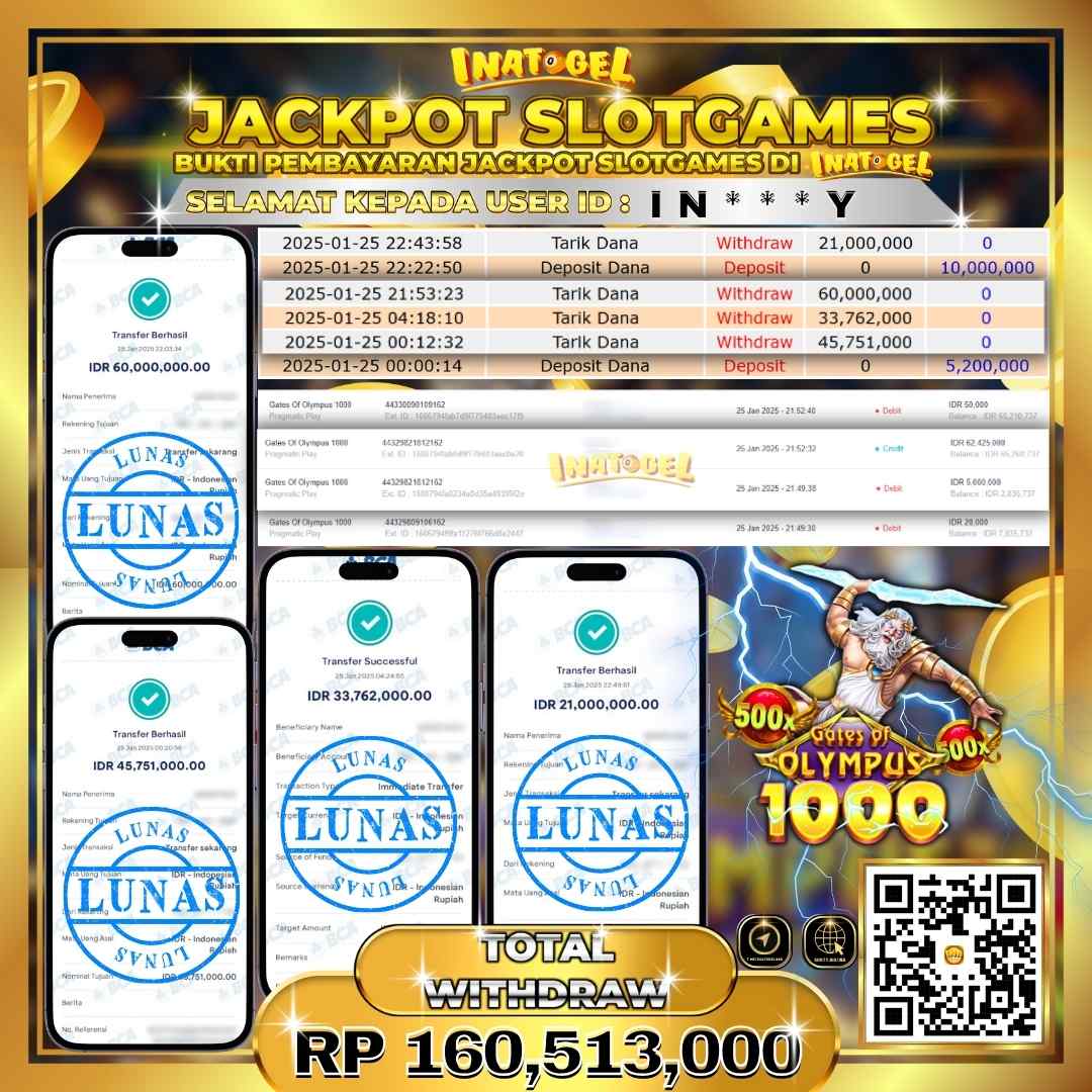Selamat kepada UserId IN***Y telah berhasil mendapatkan kemenangan jackpot pada permainan Slot Game Gates Of Olympus 1000 Inatogel sebesar Rp160,513,000,- . Inatogel situs terpercaya sejak dulu hingga saat ini , Untuk kemenangan berapapun pasti akan kami bayarkan . Jangan ragu bermain di Ina Togel . Kami pihak Inatogel Menyampaikan terima kasih kepada seluruh member Ina Togel yang telah Percaya dan setia Bersama kami bermain di Inatogel hingga saat ini.