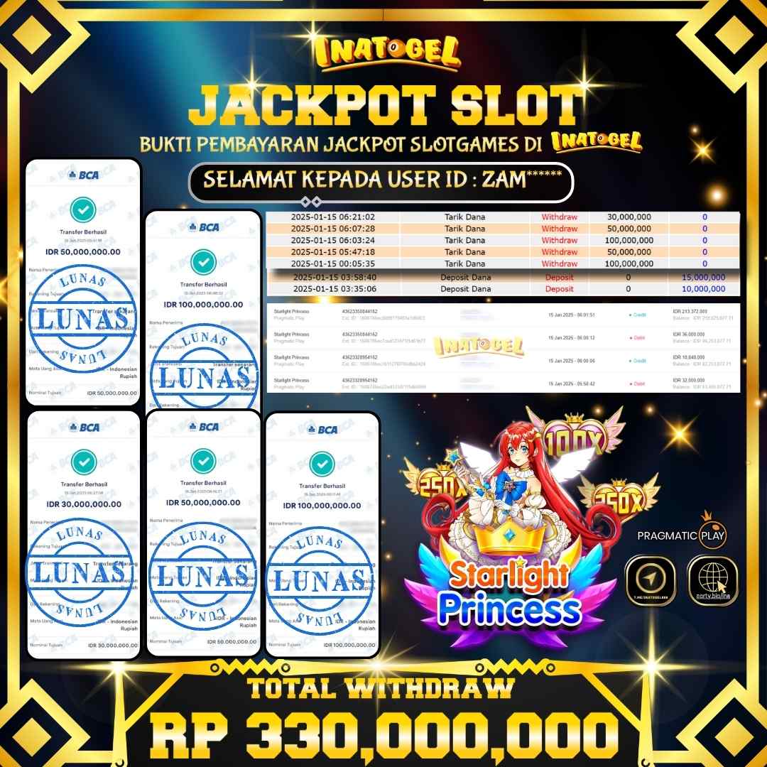 Selamat kepada UserId ZAM****** telah berhasil mendapatkan kemenangan jackpot pada permainan Slot Game Starlight Princess Inatogel sebesar Rp330,000,000,- . Inatogel situs terpercaya sejak dulu hingga saat ini , Untuk kemenangan berapapun pasti akan kami bayarkan . Jangan ragu bermain di Ina Togel . Kami pihak Inatogel Menyampaikan terima kasih kepada seluruh member Ina Togel yang telah Percaya dan setia Bersama kami bermain di Inatogel hingga saat ini.