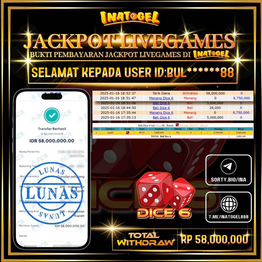 Inatogel Jackpot Live Game Dice 6 Rp58,000,000