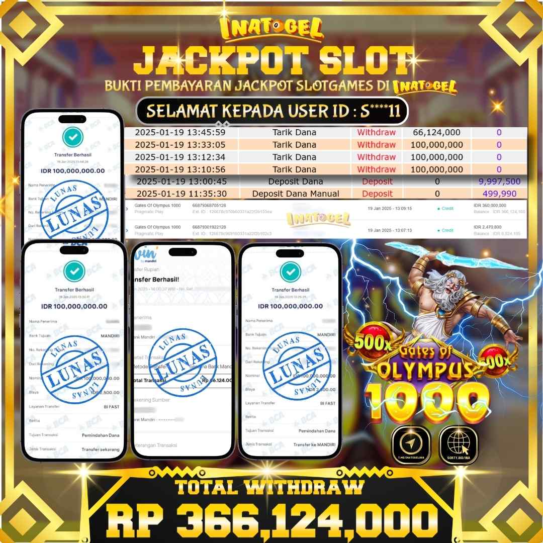 Selamat kepada UserId S****11 telah berhasil mendapatkan kemenangan jackpot pada permainan Slot Game Gates Of Olympus 1000 Inatogel sebesar Rp366,124,000,- . Inatogel situs terpercaya sejak dulu hingga saat ini , Untuk kemenangan berapapun pasti akan kami bayarkan . Jangan ragu bermain di Ina Togel . Kami pihak Inatogel Menyampaikan terima kasih kepada seluruh member Ina Togel yang telah Percaya dan setia Bersama kami bermain di Inatogel hingga saat ini.