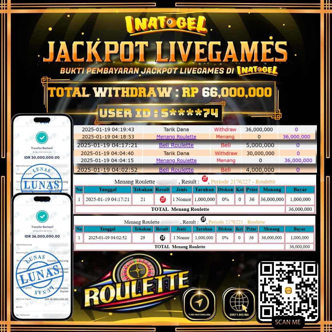 Selamat kepada UserId S****74 telah berhasil mendapatkan kemenangan jackpot pada permainan Live Game Roulette Inatogel sebesar Rp66,000,000,- . Inatogel situs terpercaya sejak dulu hingga saat ini , Untuk kemenangan berapapun pasti akan kami bayarkan . Jangan ragu bermain di Ina Togel . Kami pihak Inatogel Menyampaikan terima kasih kepada seluruh member Ina Togel yang telah Percaya dan setia Bersama kami bermain di Inatogel hingga saat ini.