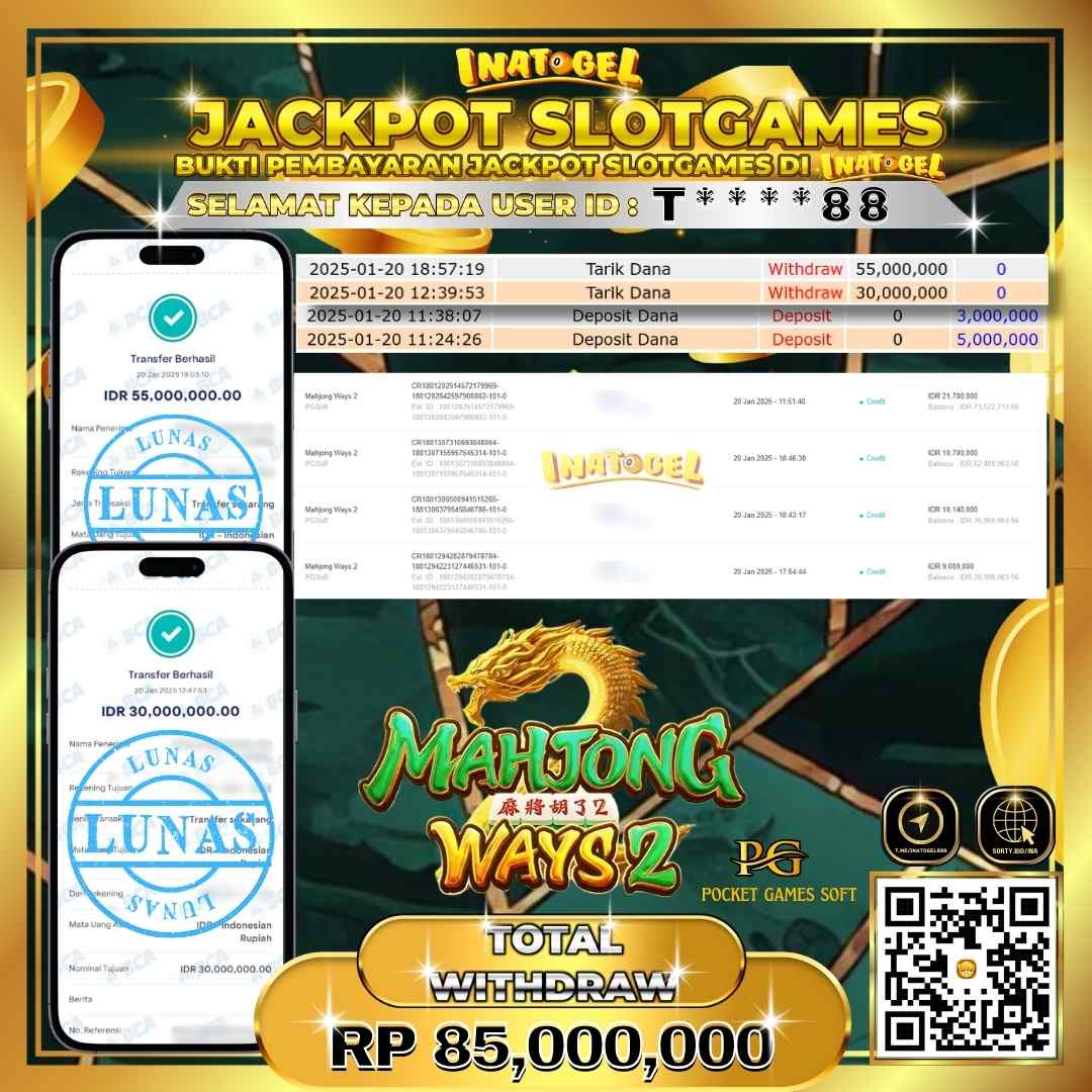 Selamat kepada UserId T****88 telah berhasil mendapatkan kemenangan jackpot pada permainan Slot Game Mahjong Ways2 Inatogel sebesar Rp85,000,000,- . Inatogel situs terpercaya sejak dulu hingga saat ini , Untuk kemenangan berapapun pasti akan kami bayarkan . Jangan ragu bermain di Ina Togel . Kami pihak Inatogel Menyampaikan terima kasih kepada seluruh member Ina Togel yang telah Percaya dan setia Bersama kami bermain di Inatogel hingga saat ini.